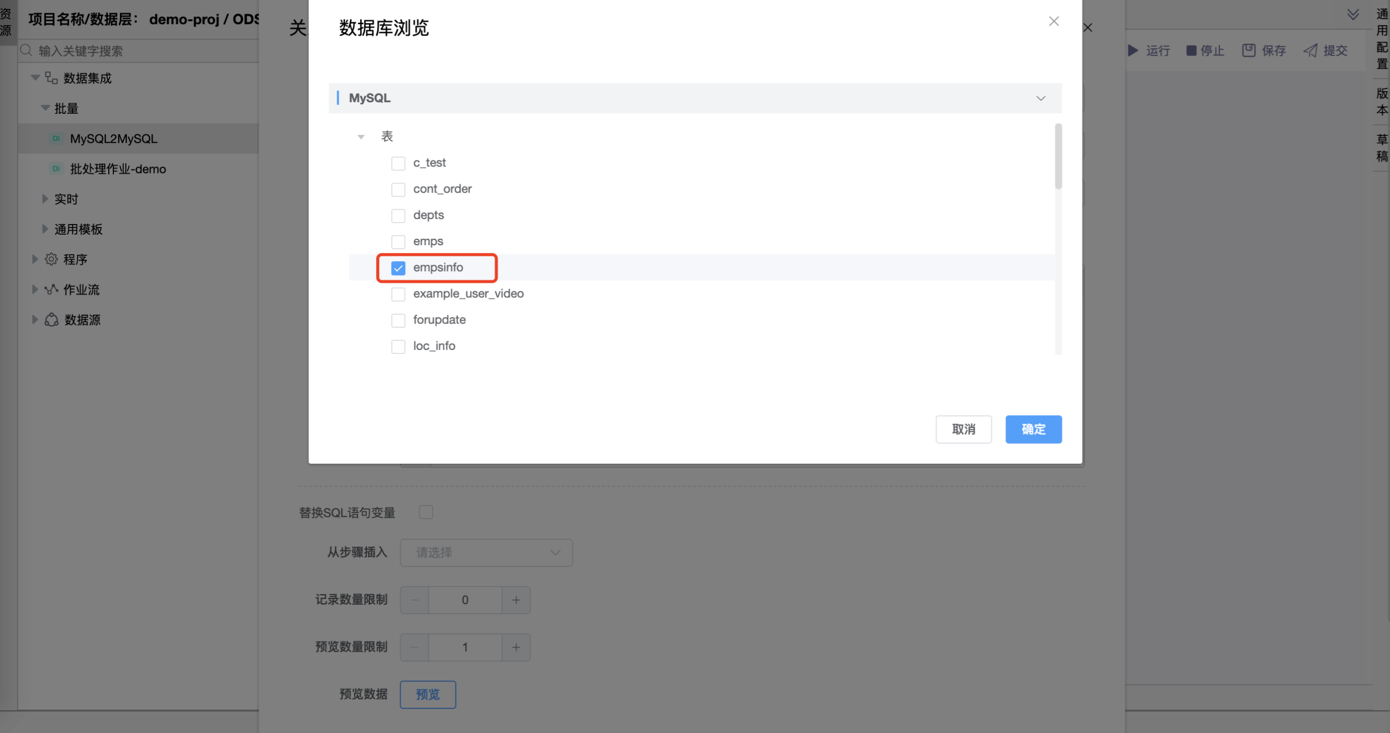 本示例主要介绍关系型数据库表的同步场景开发,该场景实现了 MySQL 中的 empsinfo 源表数据同步到 empsinfo_miggration 目标表中。