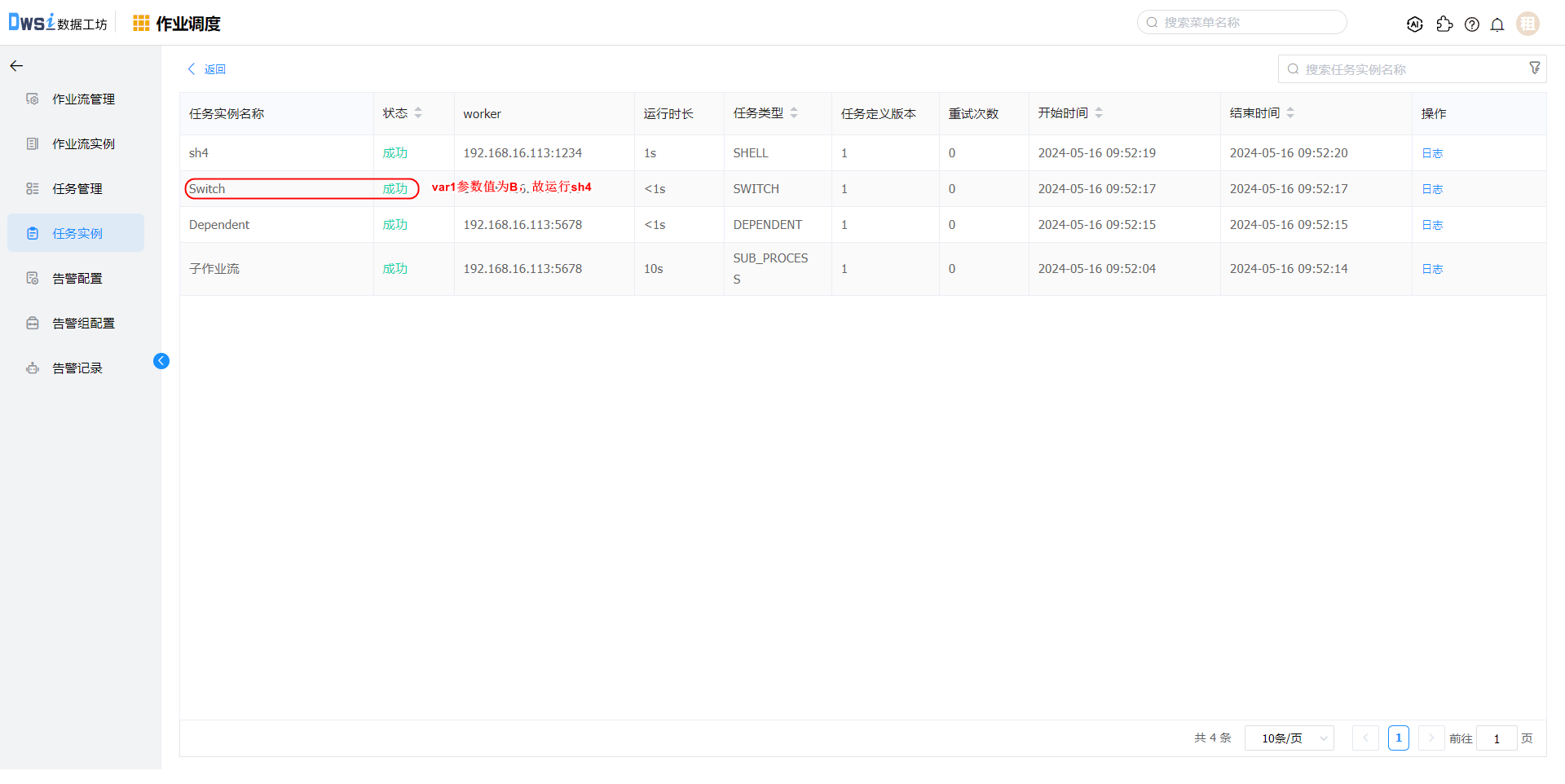 作业流中的全局参数,在运行时会传递给所有作业节点,其中转换作业DI-var会使用tableName参数,Switch组件会使用var1参数。