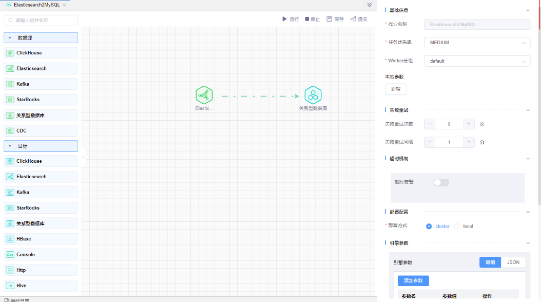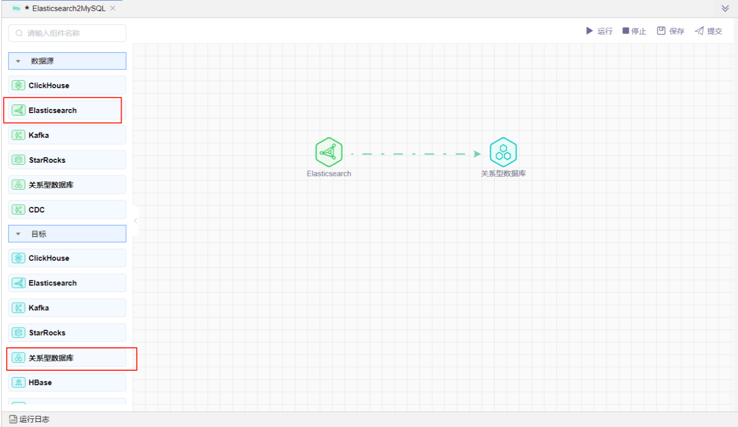 在画布中分别拖拽 1 个"Elasticsearch数据源"图元、1 个"关系型数据库目标"图元,并建立连线。