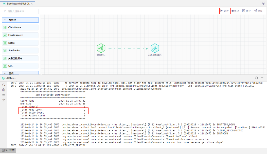 点击【运行】按钮,可以运行已经开发完毕的场景,在日志栏可以看运行日志及运行结果。