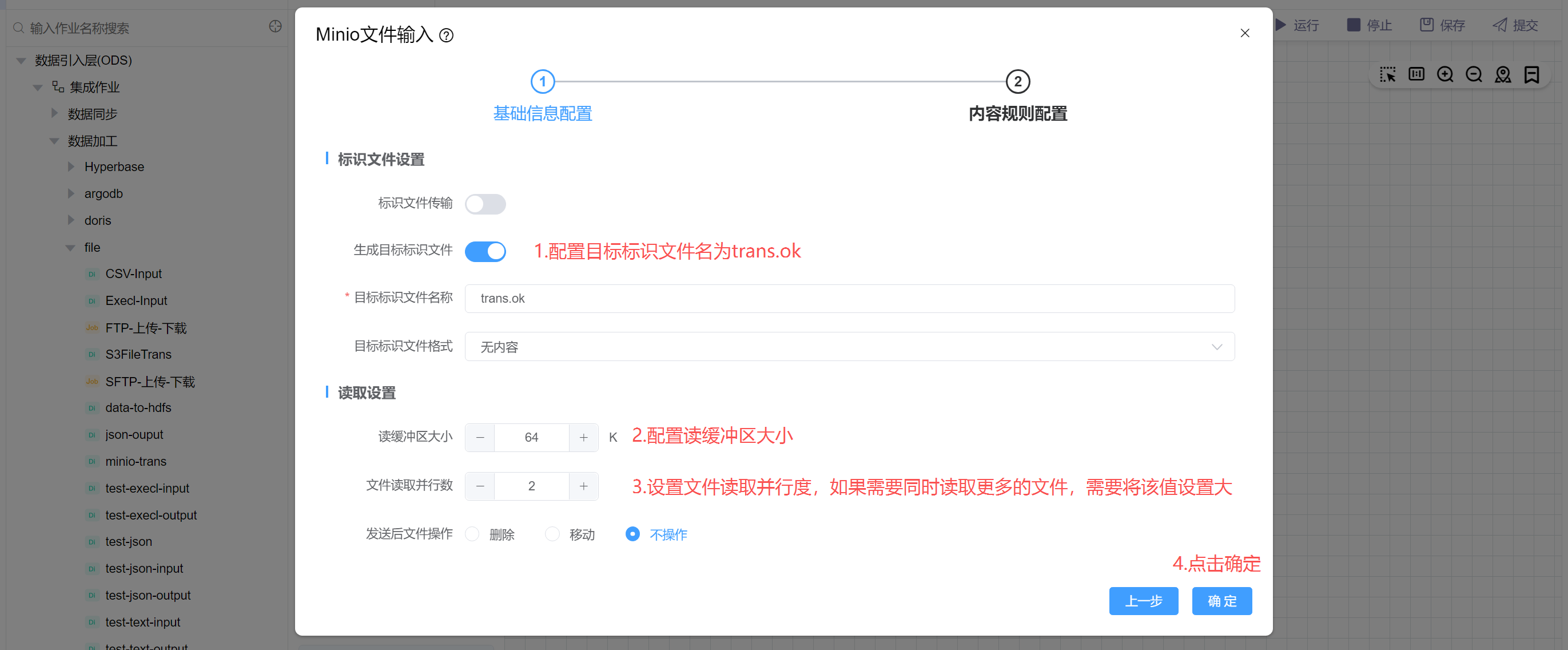配置目标标识文件为trans.ok(传输完成后会在目录目录下生成一个trans.ok文件),配置读取缓冲区大小和读取并行度。然后点击确定。