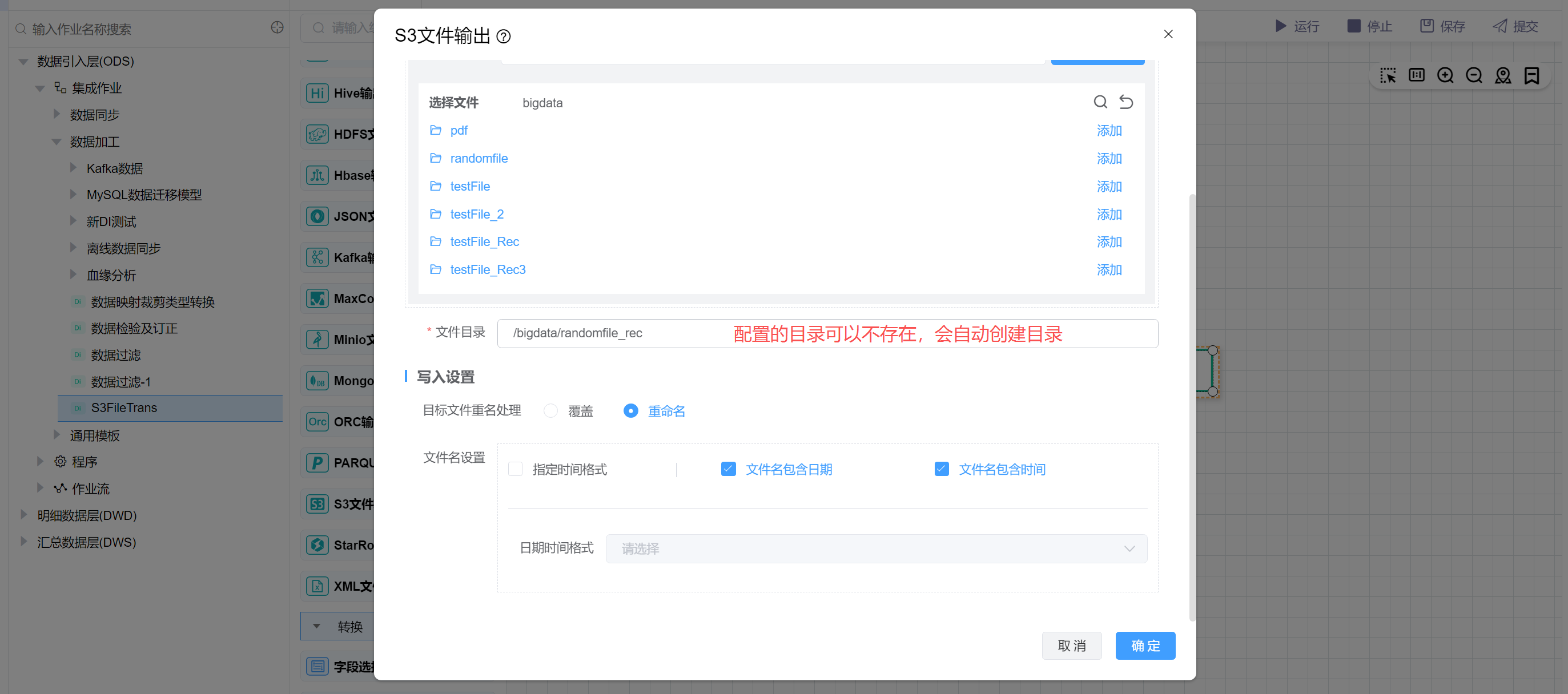 配置文件目录为/bigdata/randomfile_rec,设置文件重名处理为重命名,重命名后的文件包含日期和时间。然后点击确定。