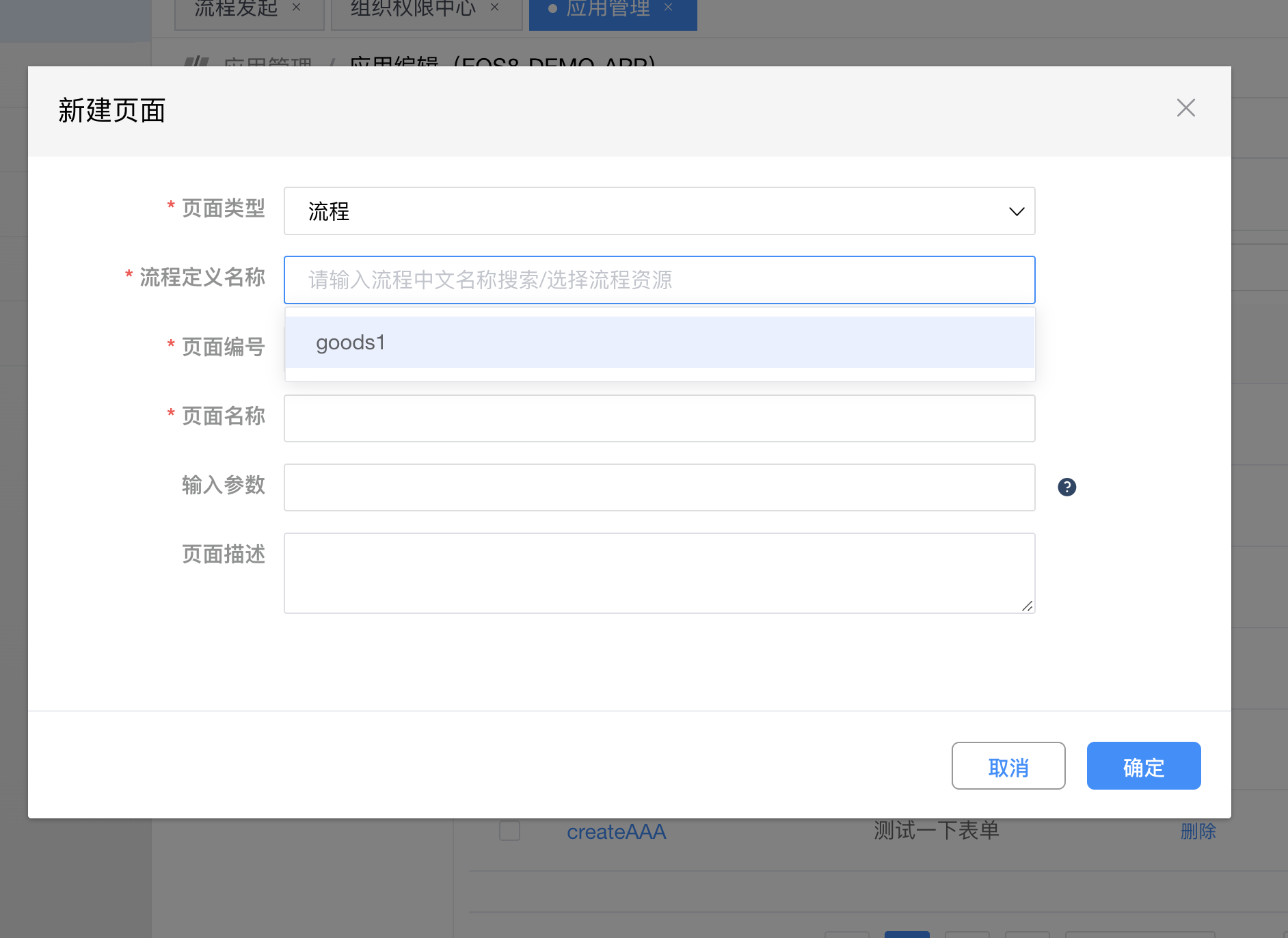 1.点击应用资源->新建页面,选择页面类型为“流程”,然后选择此应用下的流程资源;