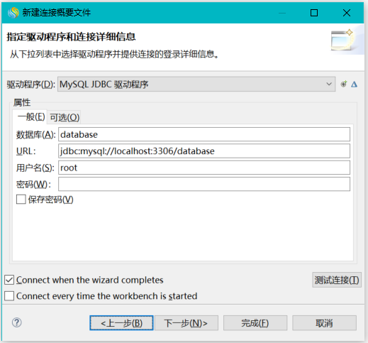 选择完驱动连接后,在“新建连接概要文件”页面的属性中,配置数据库连接信息,如下图所见。