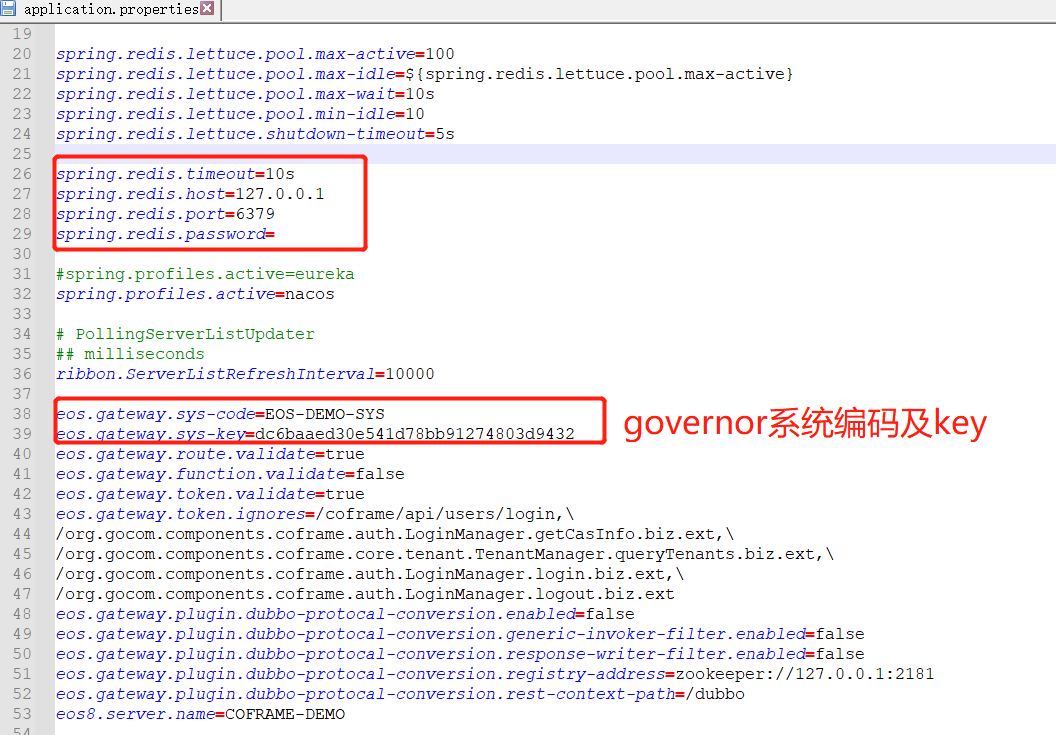 application-nacos.properties(修改nacos地址) bootstrap.properties(修改nacos地址) web/conf/eos8.conf(如下图2,需重启nginx) 修改sys-code,sys-key为governor中建立系统的key,和系统编码 afc_key