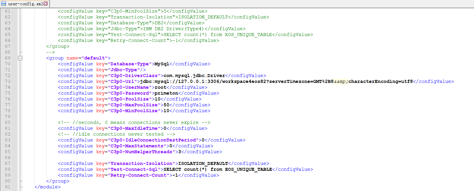 • 修改数据库连接信息(server/workspace/conf/workpace/config/user-config.xml)