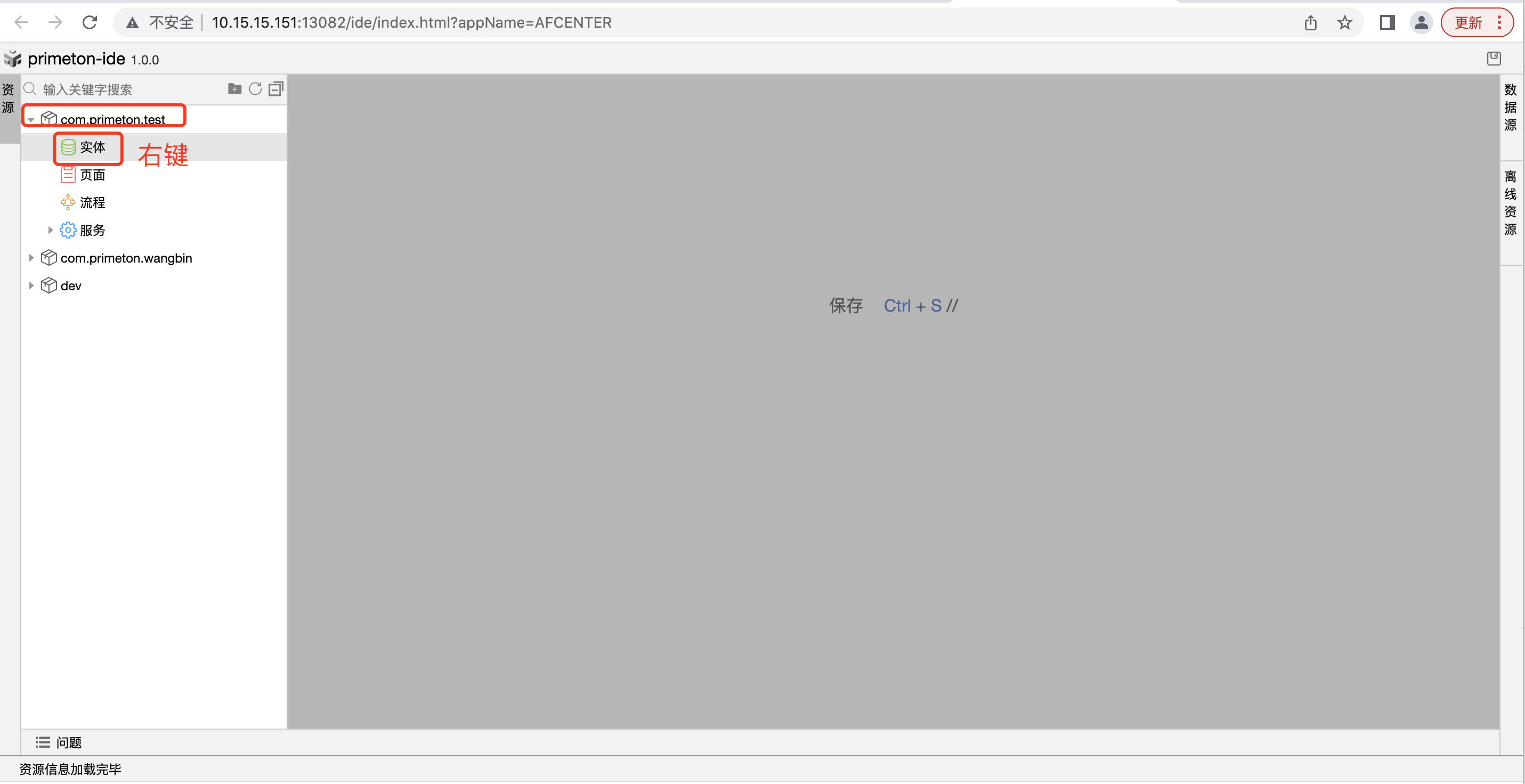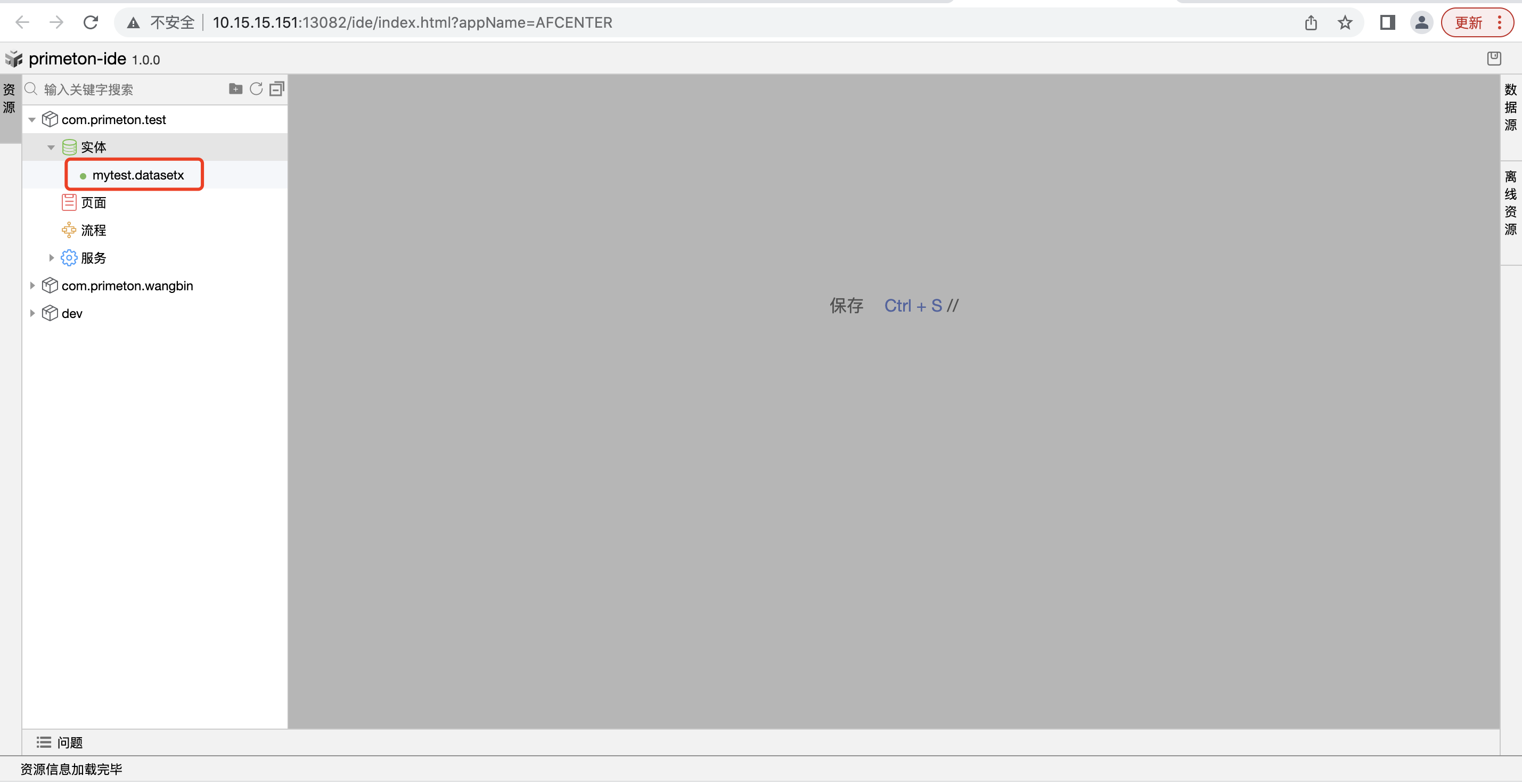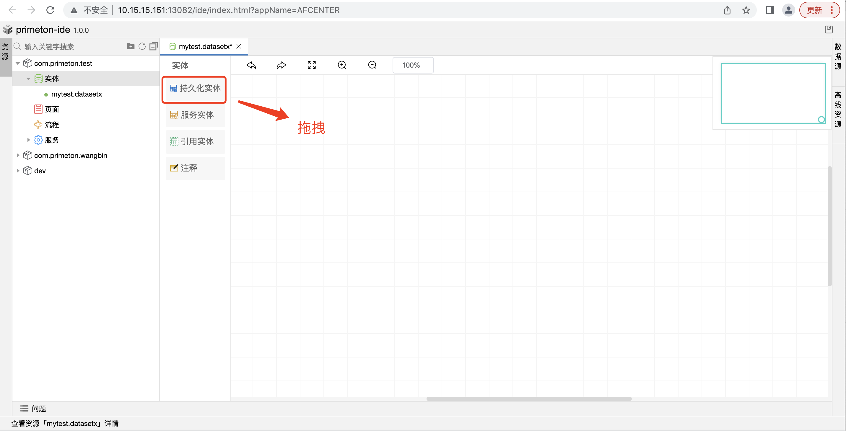 • 引用实体还可以从资源树中,选择其他实体集的持久化实体,拖入到画布中。示例是从test实体集拖入实体到本实体集中。
