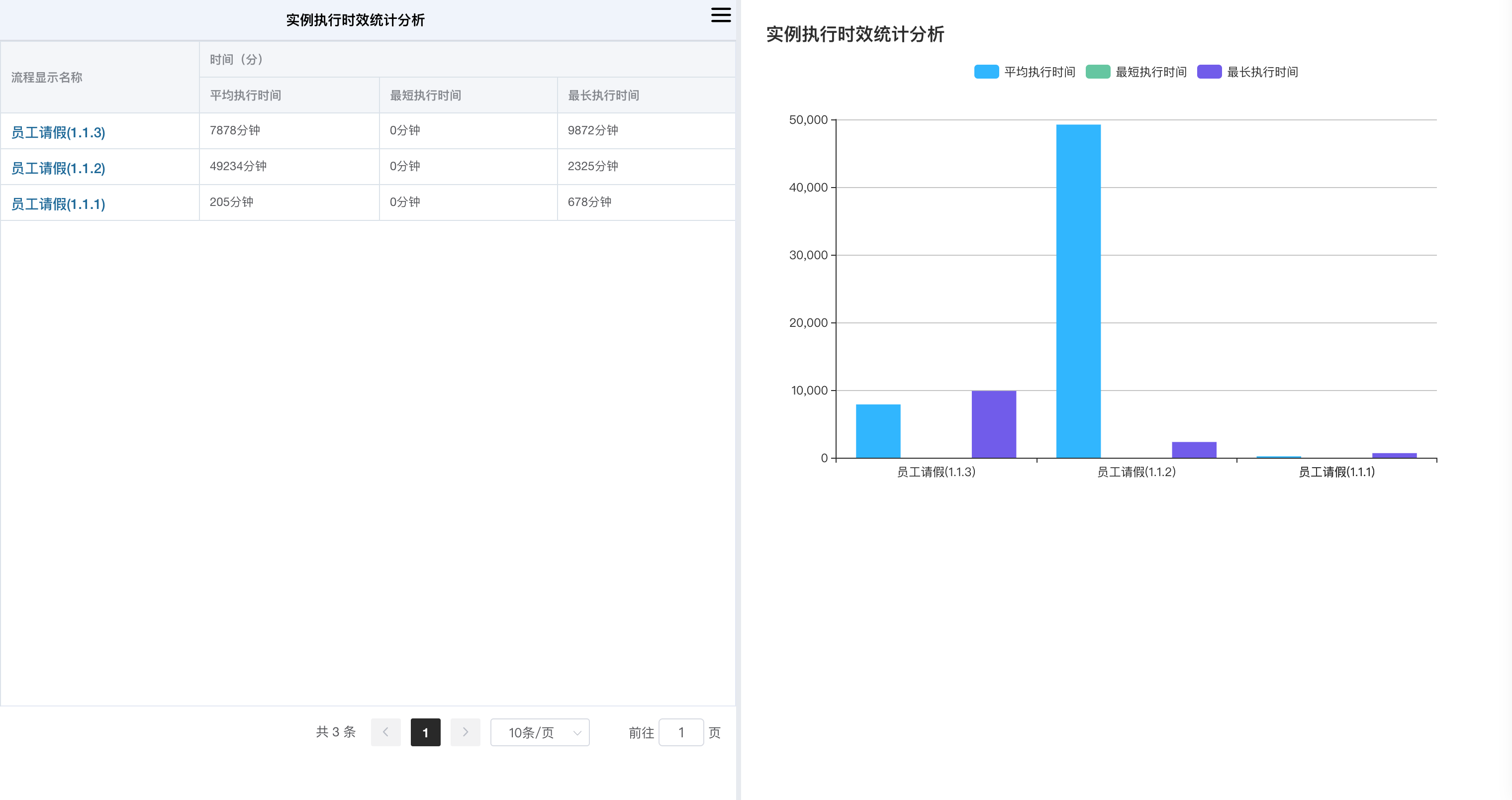 3.单击左边[活动执行时效分析]表格中的流程版本,钻取流程版本的各个环节的执行时效。单击[请假(1.1.3)],显示如下信息: