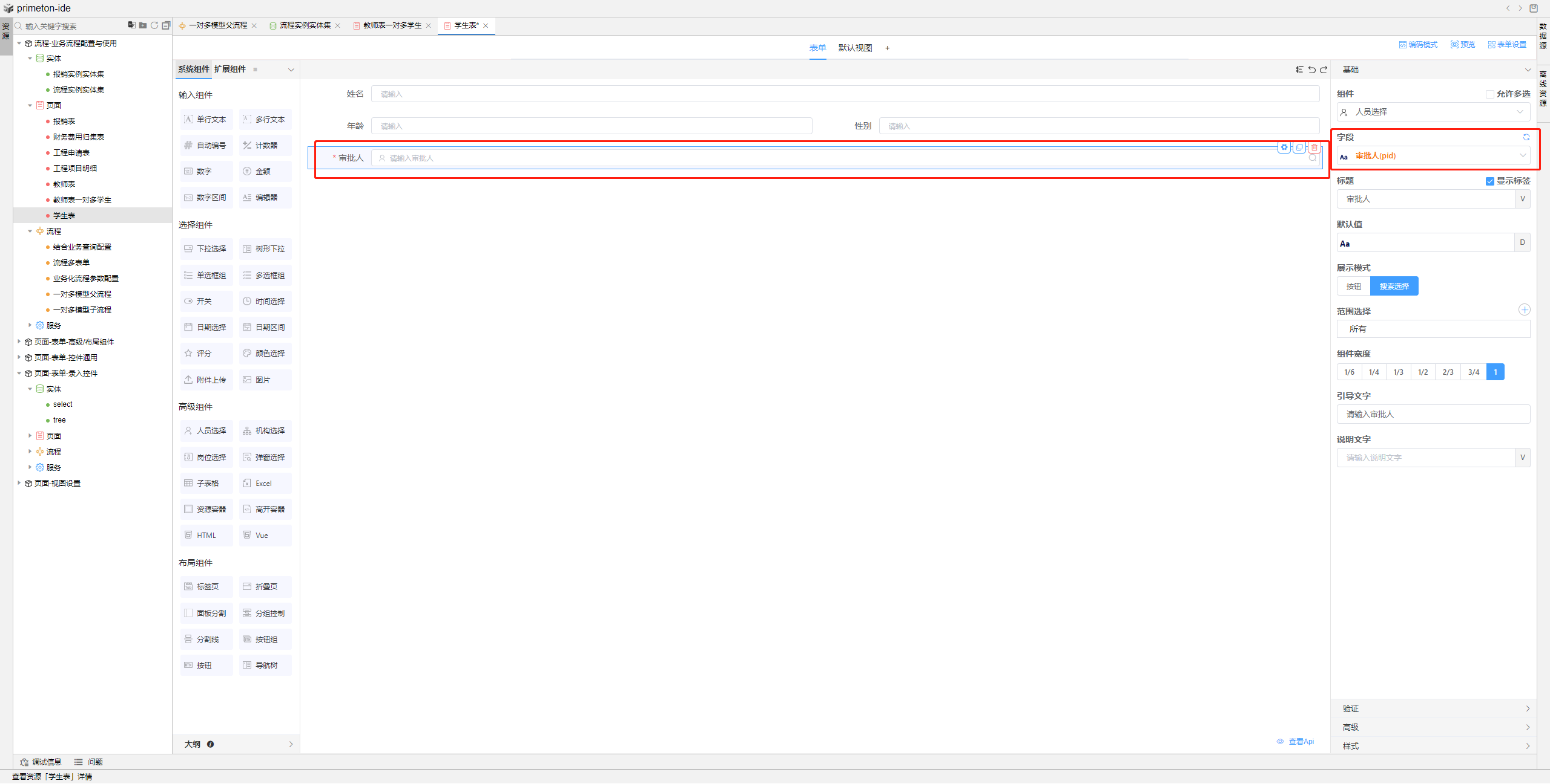 2.根据数据实体创建子流程表单页面,n端作为子流程页面,具备可以自定义选择参与者功能,需要拖动一个人员选择组件,绑定审批人字段,打开高级选项,开启流程参与者按钮。