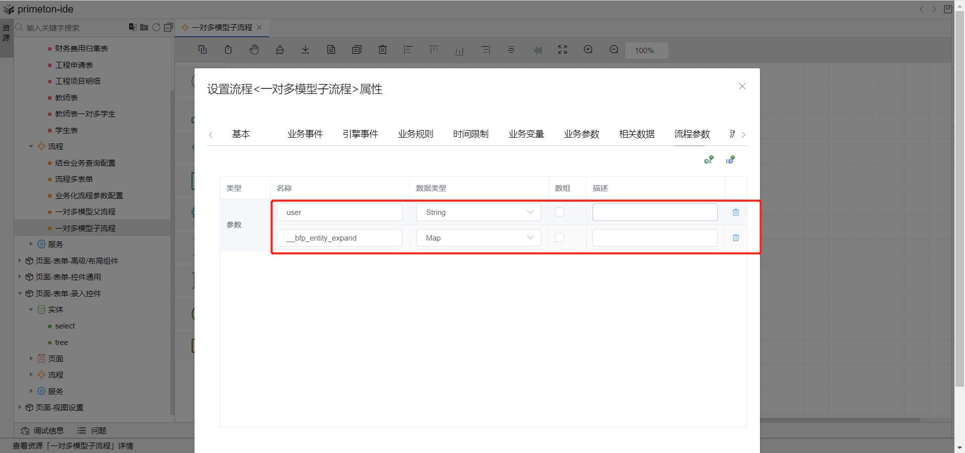 4.首先创建子流程,绑定刚刚创建的n端子流程表单,双击空白打开流程属性定义页面,选择流程参数tab页,创建user参数用于接收父流程配置的参与者,__bfp_entity_expand参数是固定格式,用于接收父流程表单页面的参数传递。