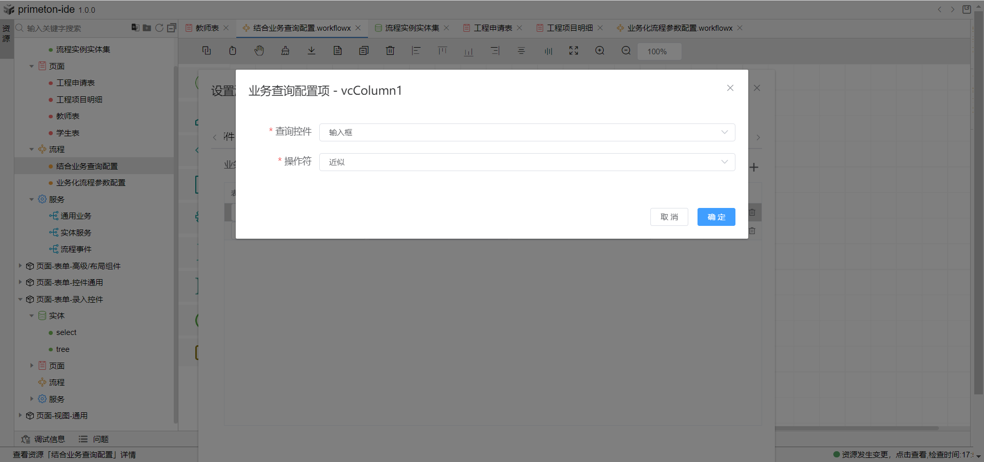 2.点击配置项图标,打开业务查询详细配置,绑定查询控件与操作符,如果查询控件选择单选框,可以绑定字典值,或者自定义选项值。配置完成后保存流程即可。