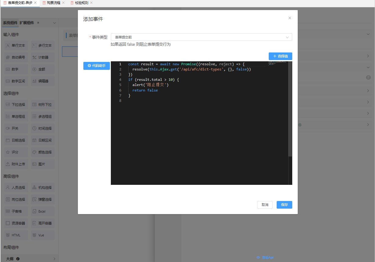 场景:表单提交前,调用接口,确认一下数据是否满足条件,不满足则不允许提交