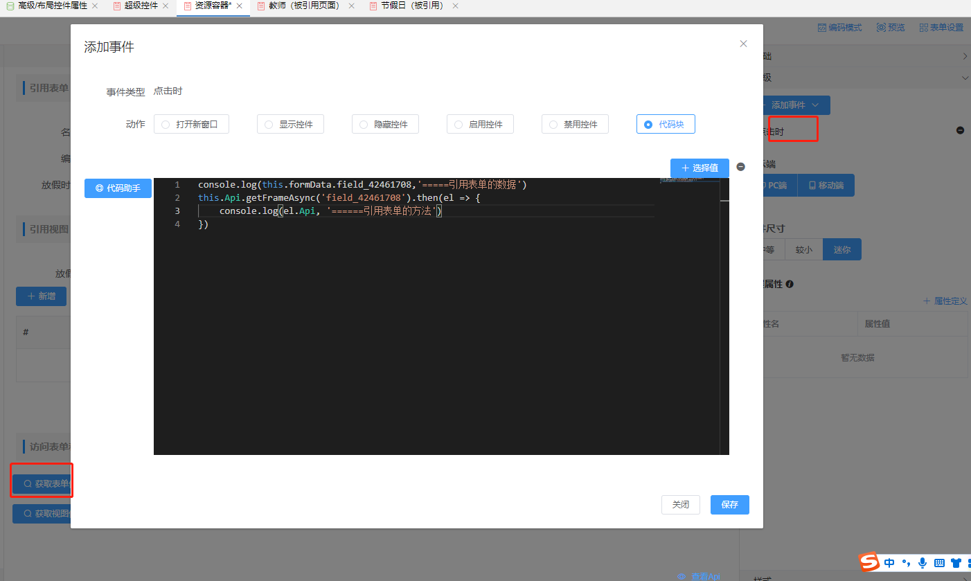 步骤2. 在高级里添加事件(菜单被点击时),选择代码块,可以获取到当前点击节点的数据action(菜单的action类型)和node