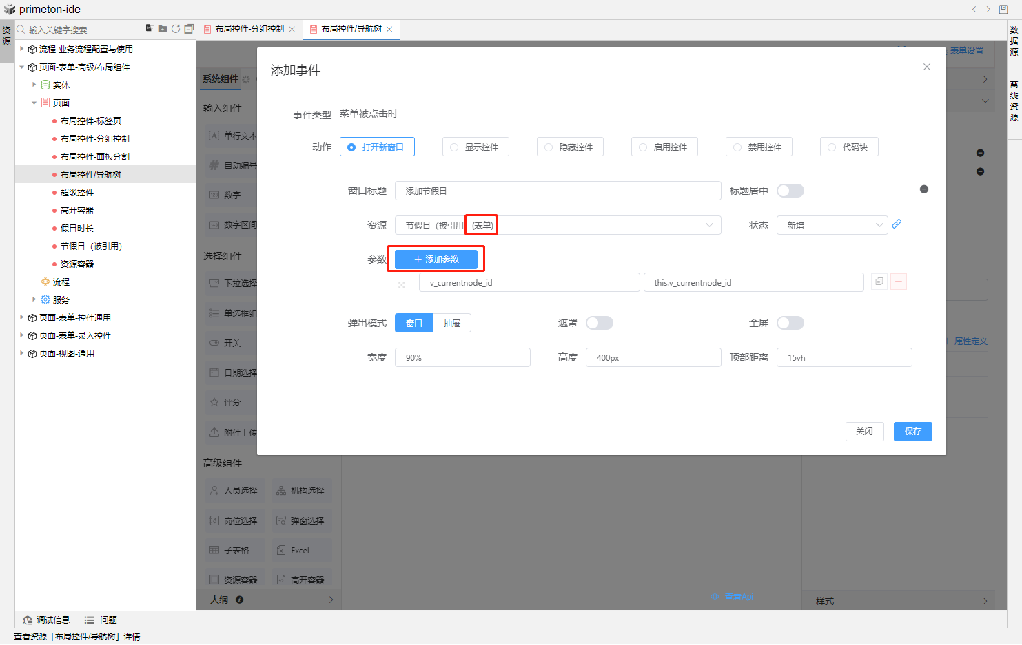 步骤1. 左侧导航树组件—动态数据选择<假日时长>实体,节点配置的基础配置-显示字段(time)和菜单配置添加action(add)