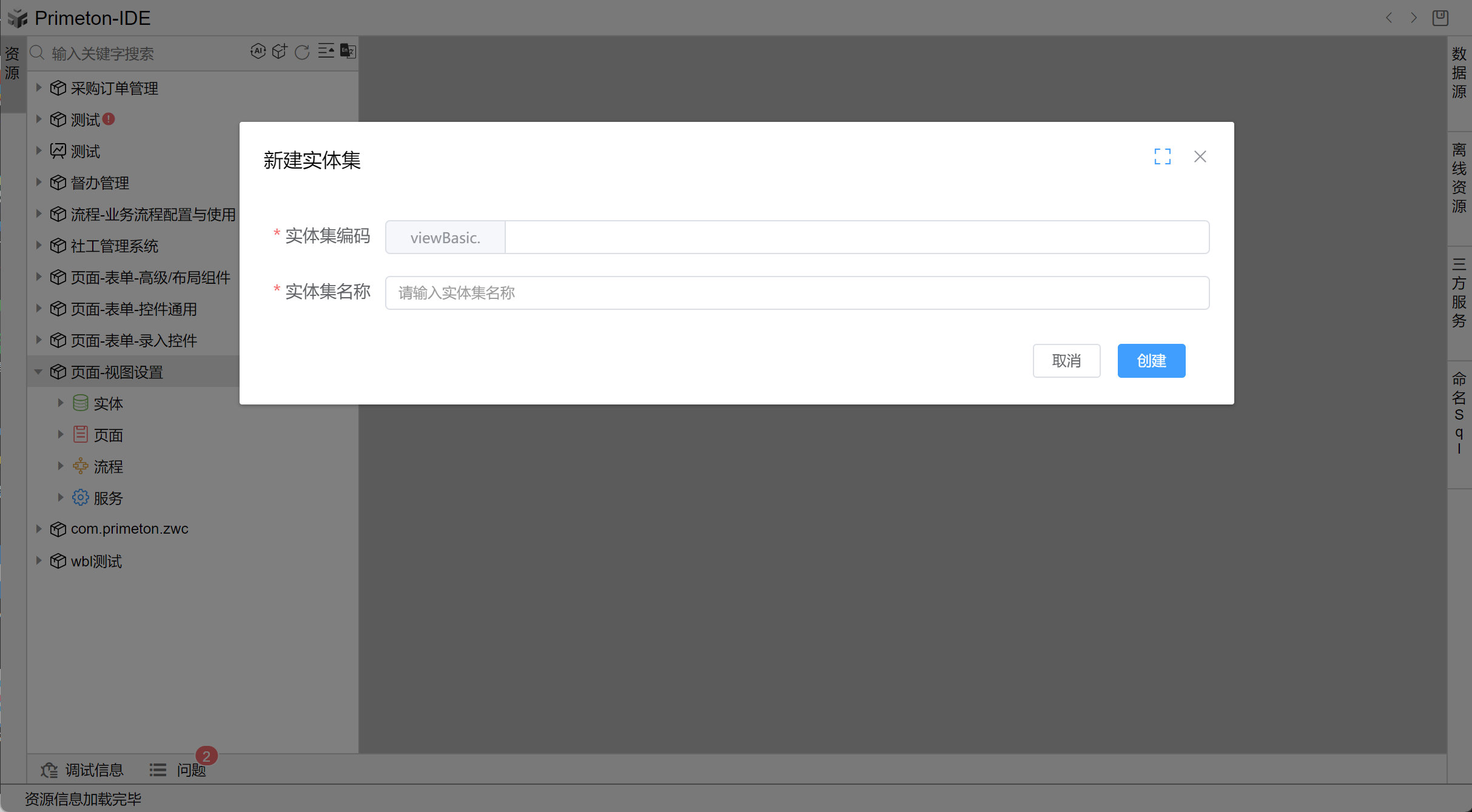2 在弹出的弹框中输入实体集编码和实体集名称。