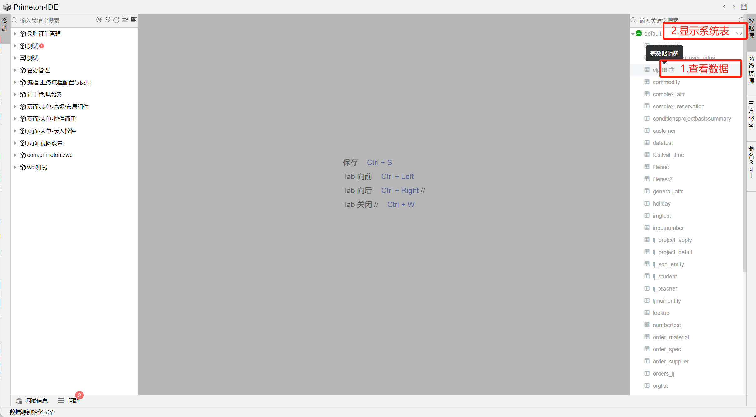 用户可以通过点击数据源一级目录(数据源类型)右边的图标(图二中2),根据自己的需求和偏好,自由地选择是否展示系统表。