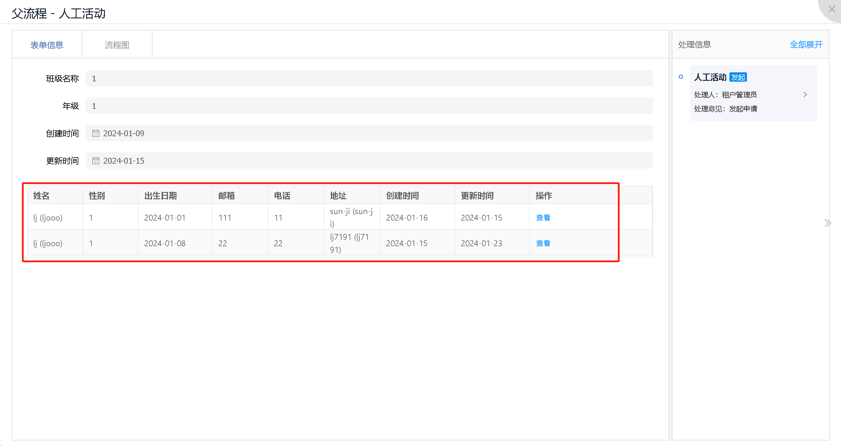 发起父流程,当激活子流程活动实例时根据主流程表单中__bfp_entity/Students数组长度循环遍历生成对应个数的子流程实例。
