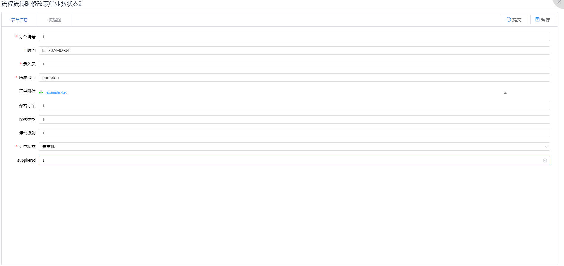 以下图订单审批流程为例,在"订单填报"、"订单信息审核"环节,实现业务表单中"状态"值为"未审批"、"已审批"的自动更新。
