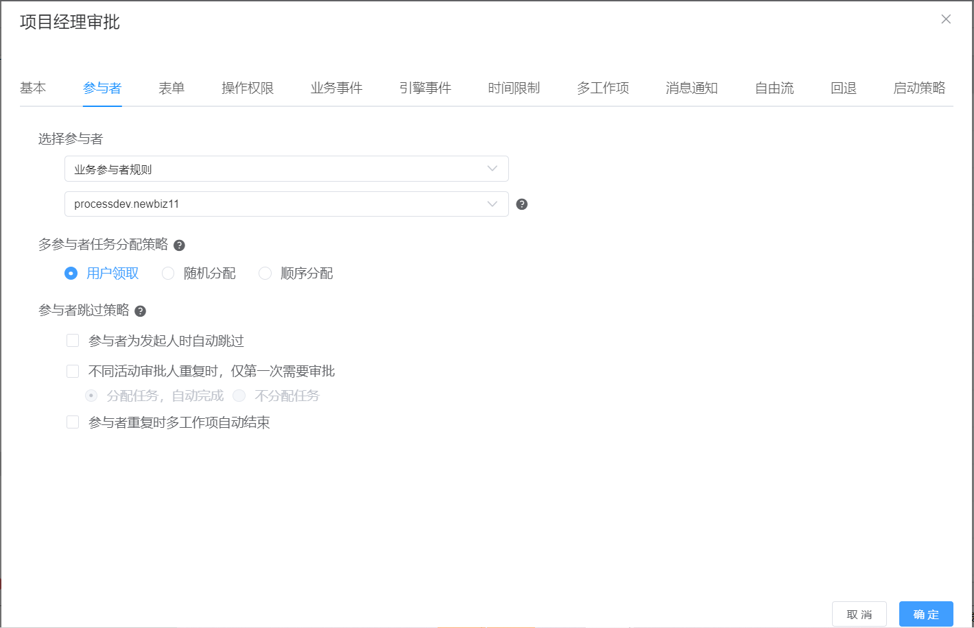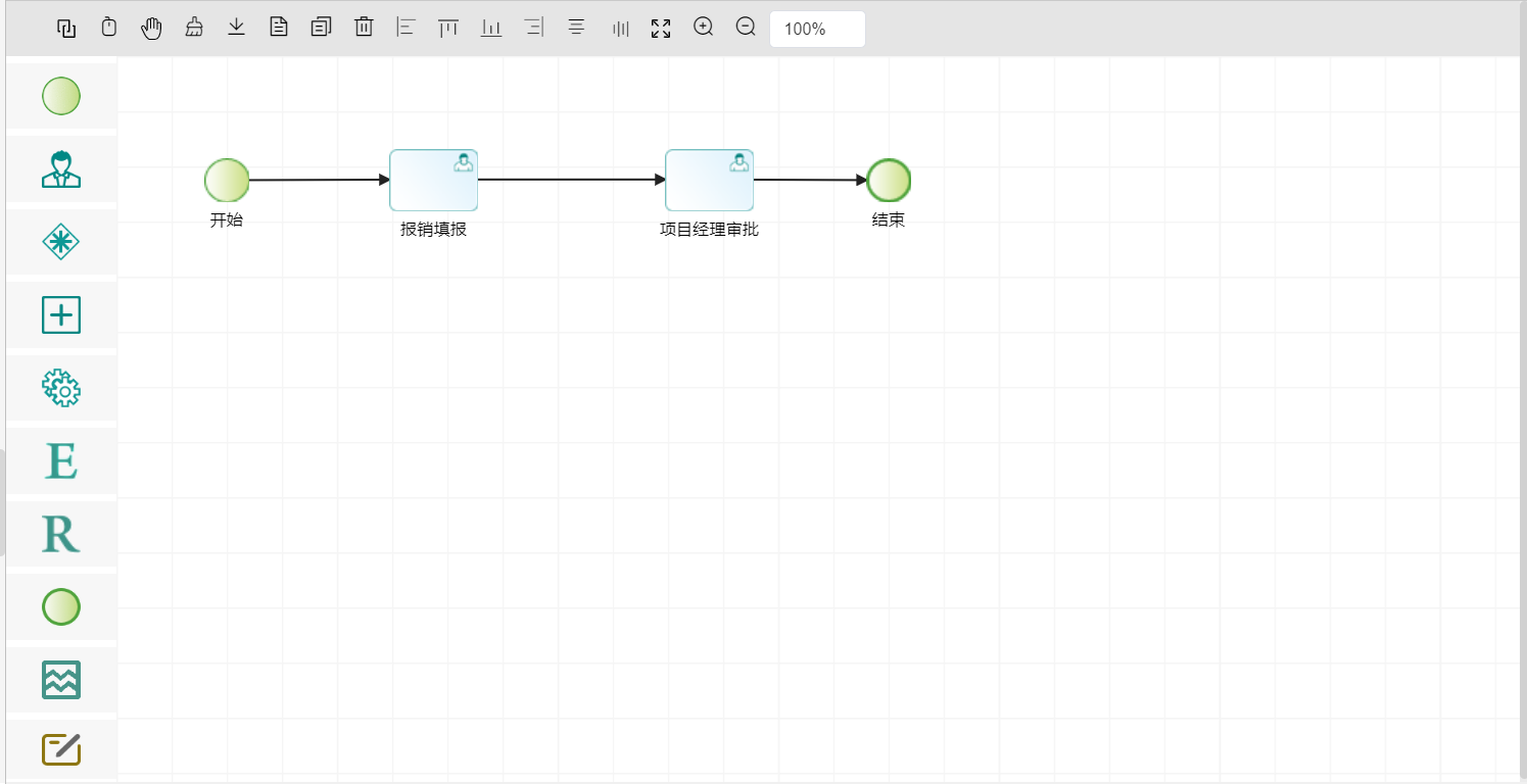 • 创建流程,绑定表单,报销填报环节参与者选择流程启动者,项目经理审批环节需要通过逻辑流实现自定义业务参与者规则。