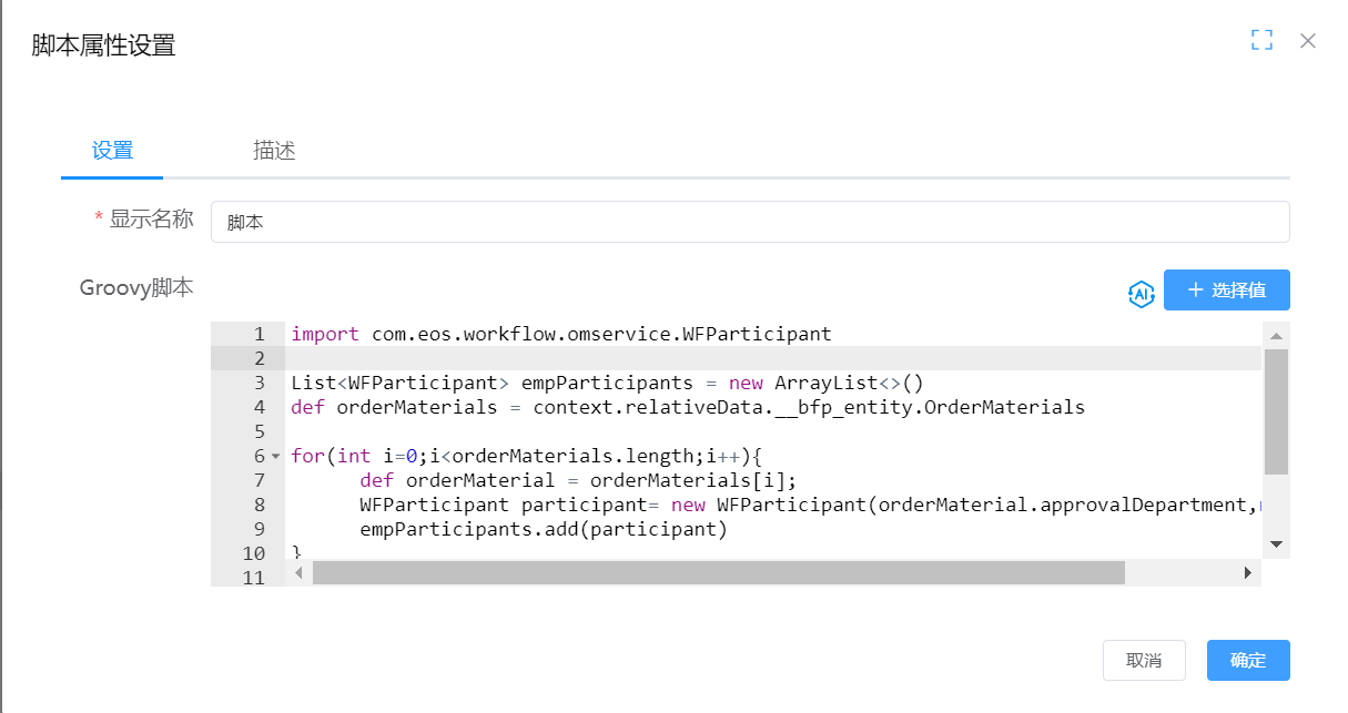 • 流程事件-新建服务,拖入脚本图元,双击打开脚本图元,写Groovy脚本实现自定义参与者获取。