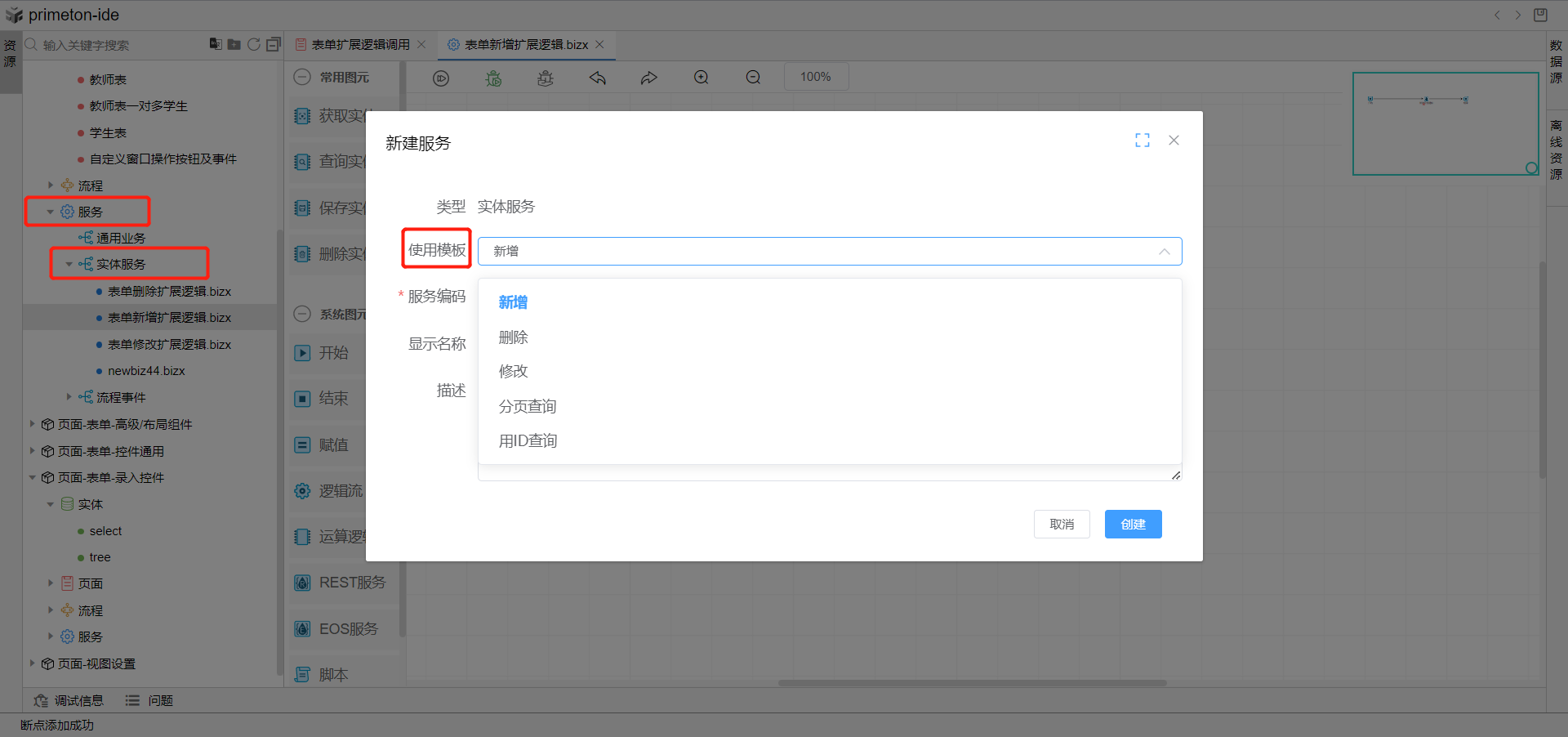 2.点击服务中的实体服务,右键创建一个实体服务,使用模板选择新增(如果是修改或者删除的扩展逻辑这里就选择对应的修改或者删除模板)