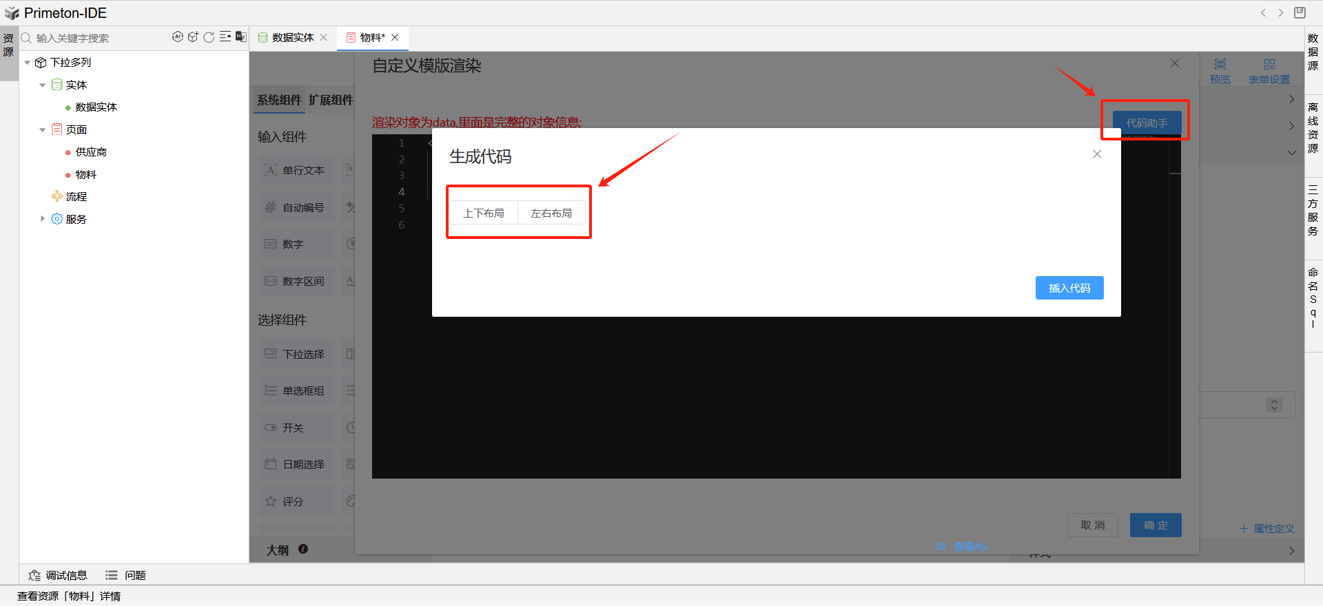 通过下拉组件-高级-自定义渲染模板,编写html代码实现下拉多列(代码助手提供上下和左右布局的示例代码)。