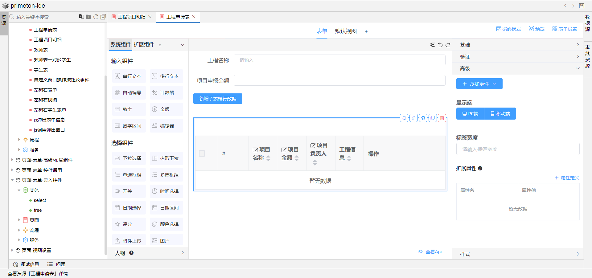 2.拖动子表格组件并绑定工程项目表,子表格绑定n端实体对象字段。