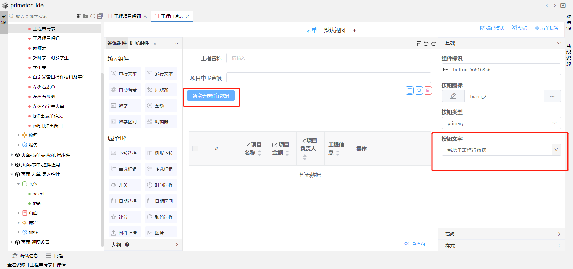 使用场景:工程表与工程项目表为1:n持久化实体模型关系,工程表表单中通过自定义按钮点击后新增工程项目表中的数据行,工程表中项目申报总金额会自动根据子表格中填写的每一个项目金额进行汇总显示出来。