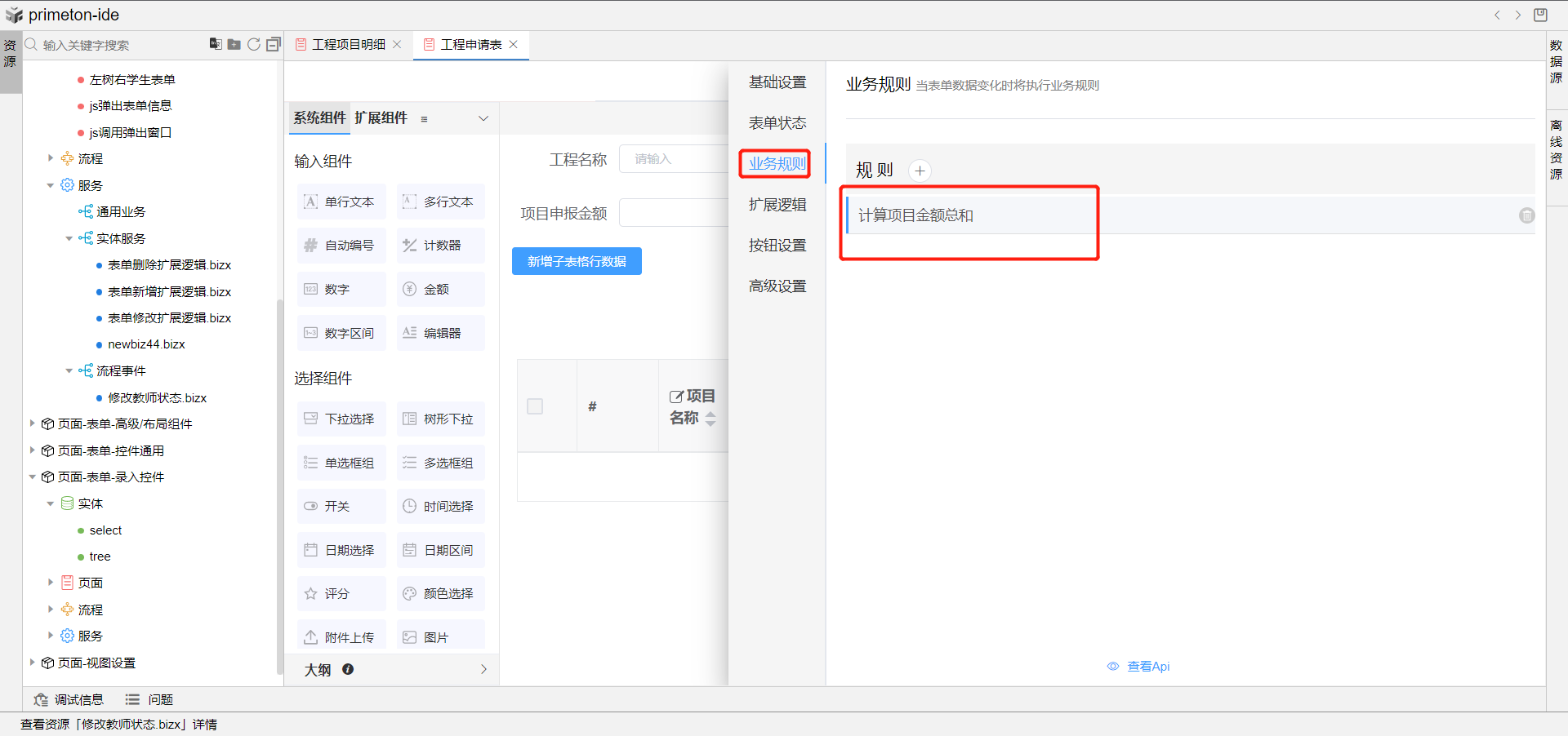 4.打开表单设置中业务规则,新建业务规则,输入名称-计算项目金额总和,在规则编辑器中写入如下js: