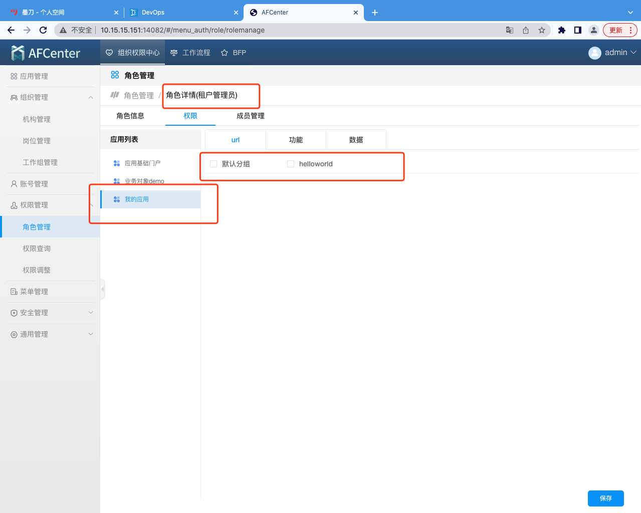 进入角色管理,给租户管理员(afc-role-tenant-manager)加上页面资源权限。