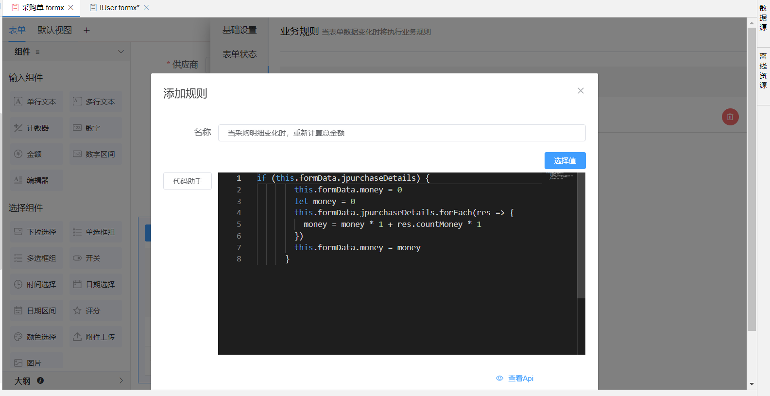 3.表单内的组件字段元素都存放在formData中,表单设计器的js编辑器中都可使用this.formData.XXX(组件字段)拿到当前组件的值完成一系列场景实现。例如: