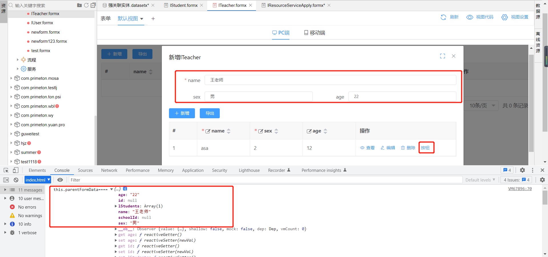 例如在Iteacher的表单中放入绑定IStudent的子表格组件,在IStudent的视图中就可通过this.parentFormData拿到作为父表单的ITeacher表单中formData的数据。如下图所示,在子表格行操作按钮中写下触发事件在控制台打印this.parentFormData参数,即可看到ITeacher的formData数据展示在控制台中。