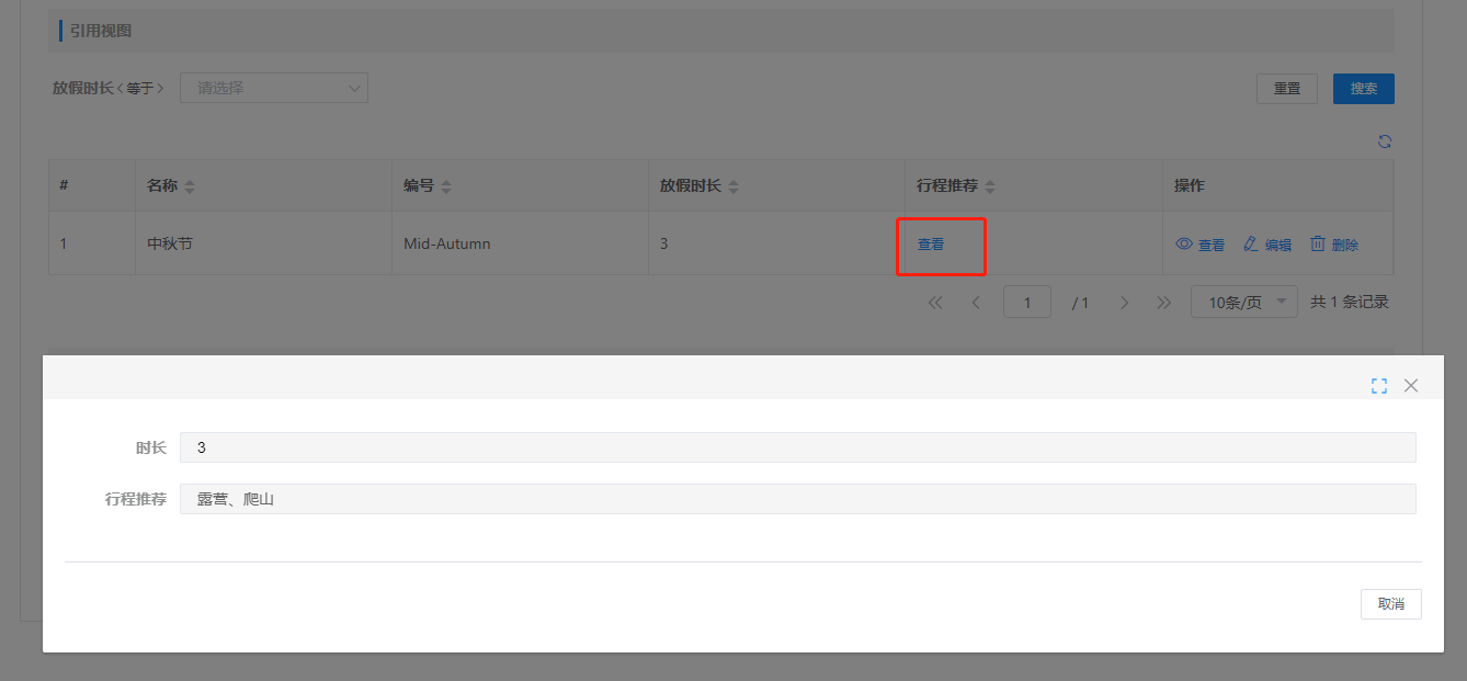 在视图设置的高级设置—快速筛选,添加删选条件(放假时长);默认值选择参数rest;显示选择隐藏