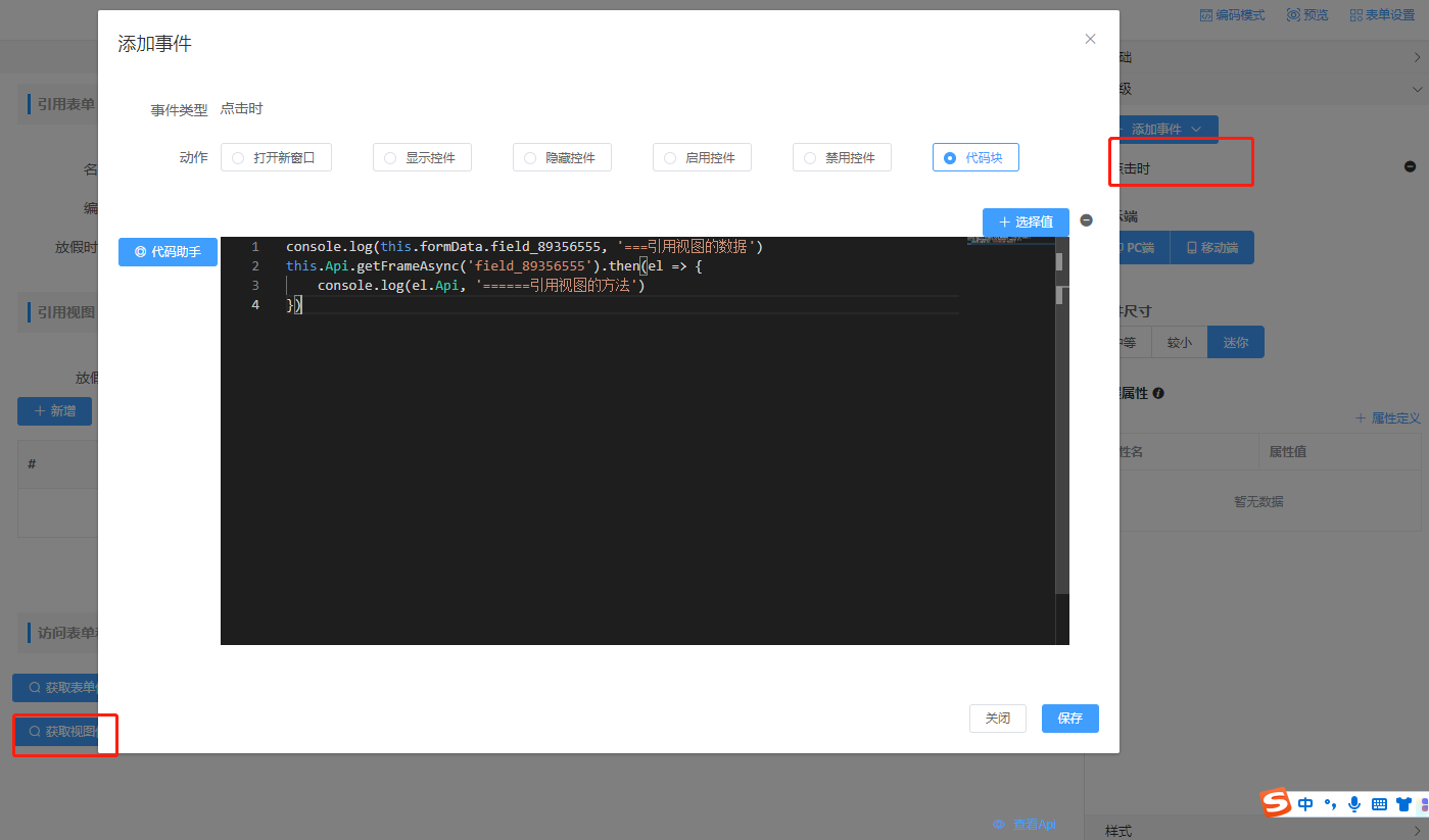 步骤2. 在高级里添加事件(菜单被点击时),选择代码块,可以获取到当前点击节点的数据action(菜单的action类型)和node