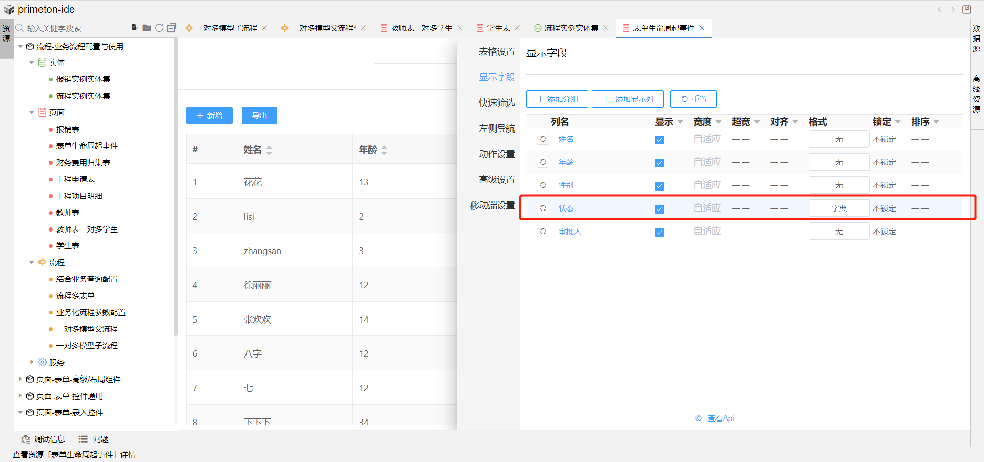 2.切换到试图页,打开视图设置,选择显示字段tab页,添加状态字段显示列,并设置他的格式化为字典类型,绑定对应的状态字典。