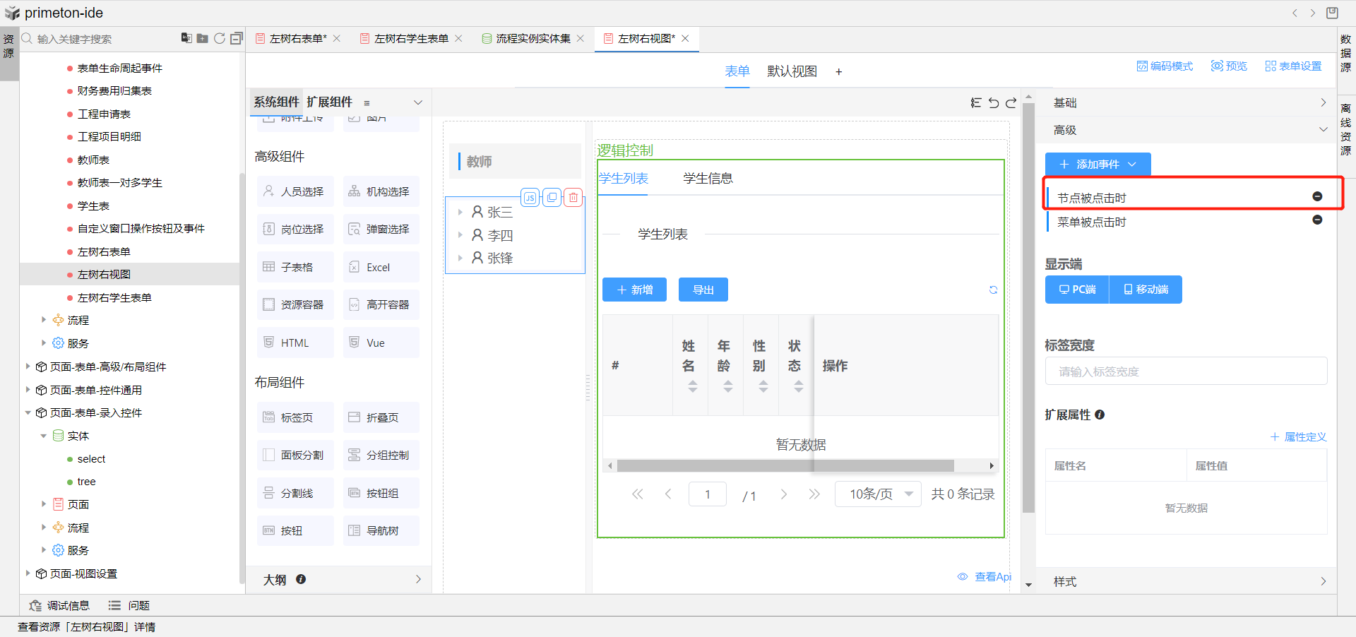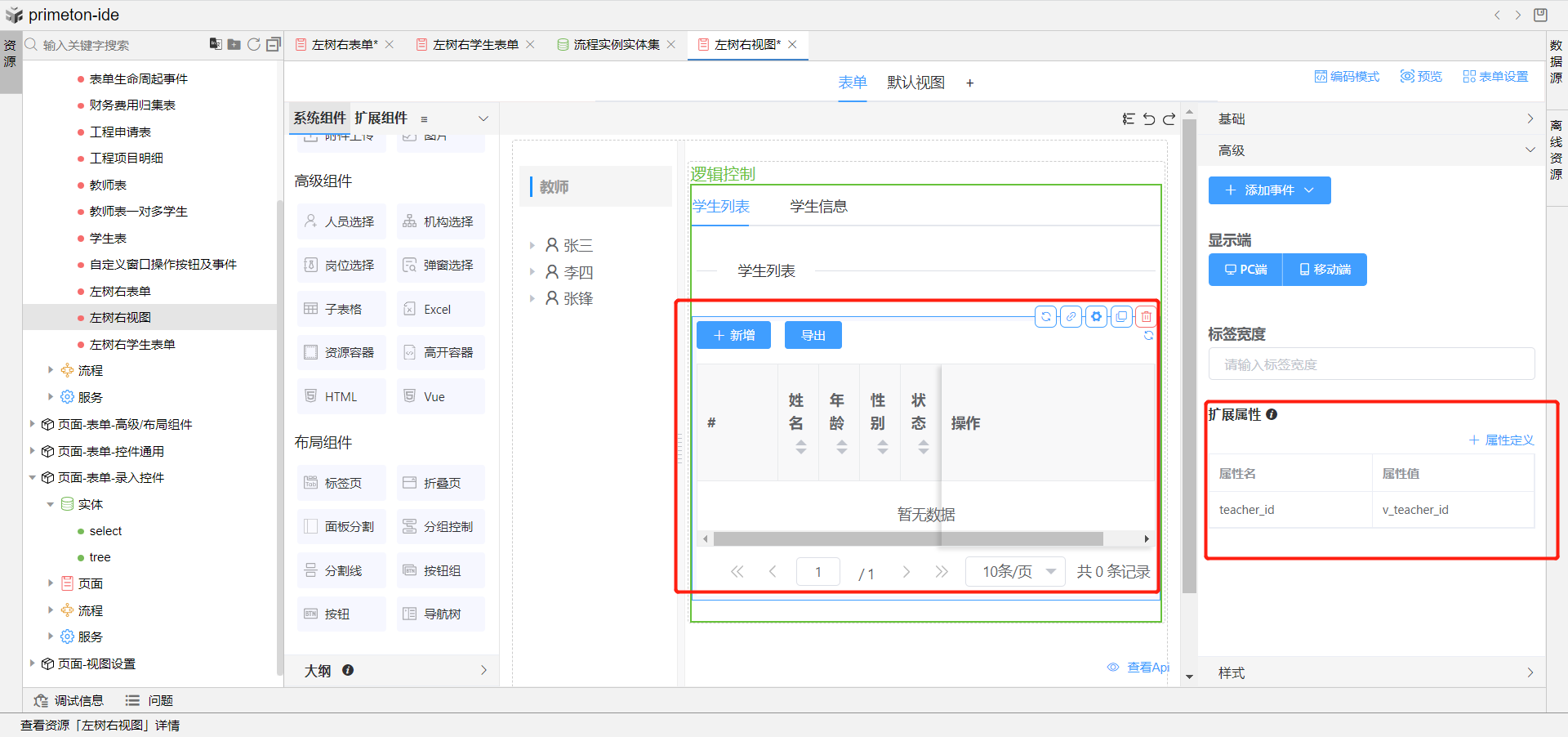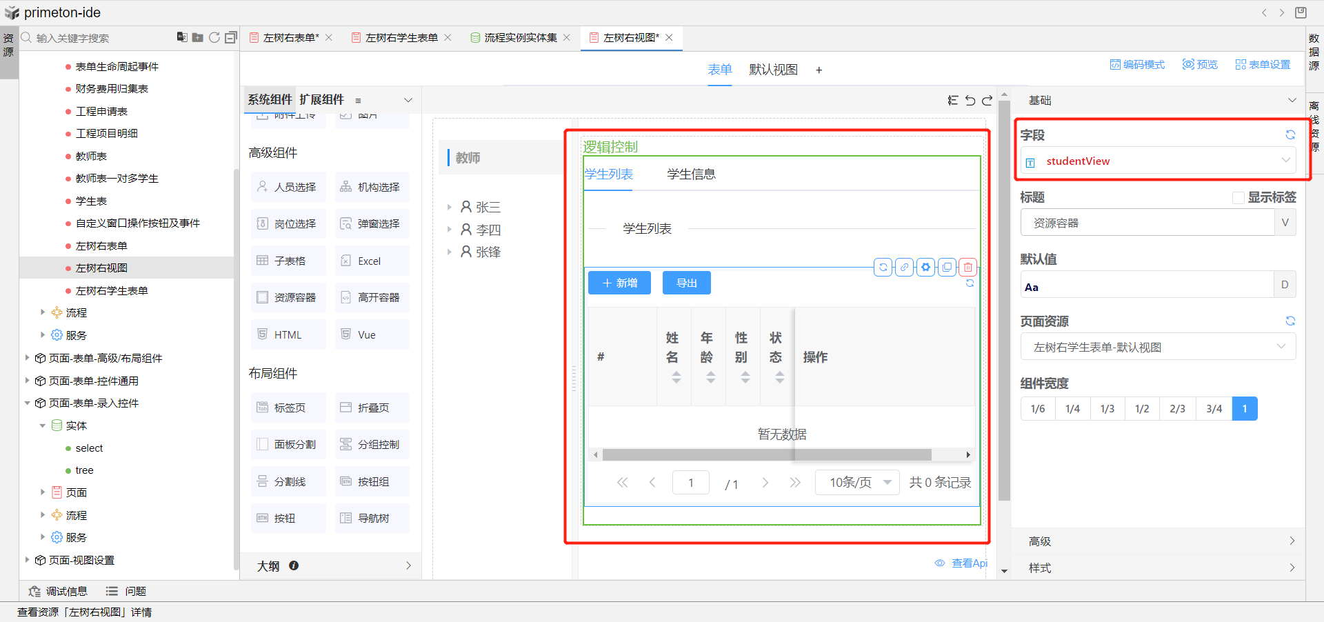 7.完成上述配置,即可预览左树右视图成果展示,点击左侧树教师信息,即可在右侧展示该教师下得学生信息视图。