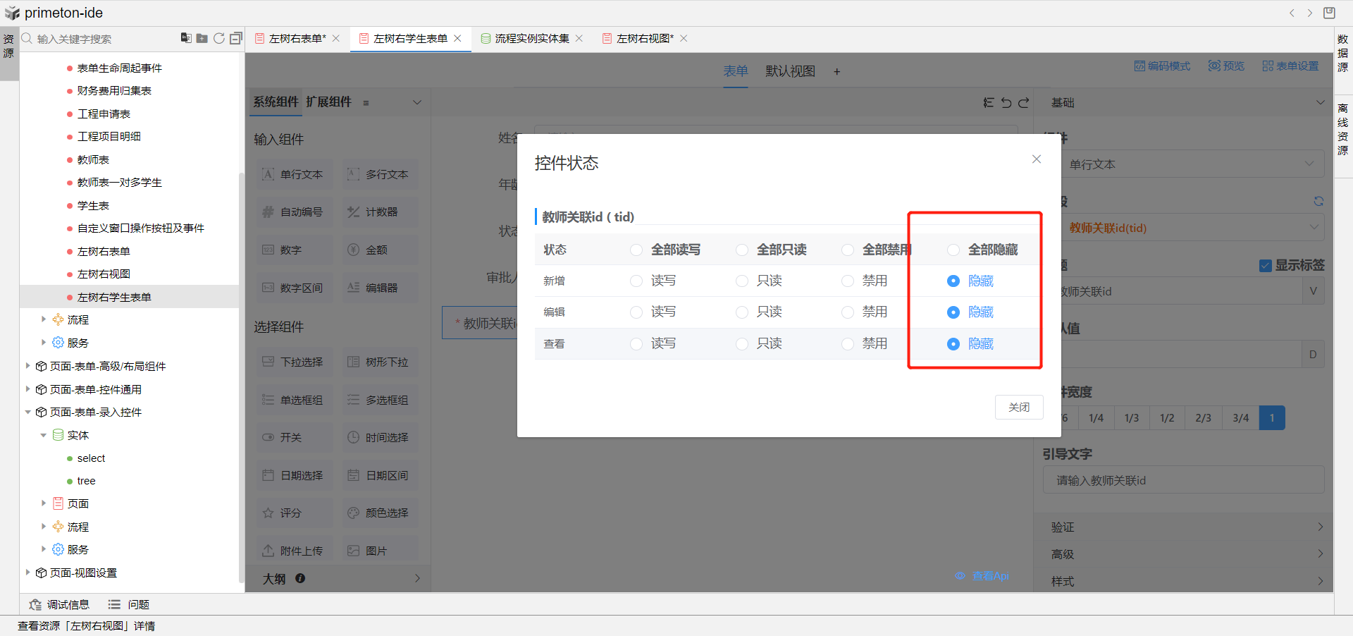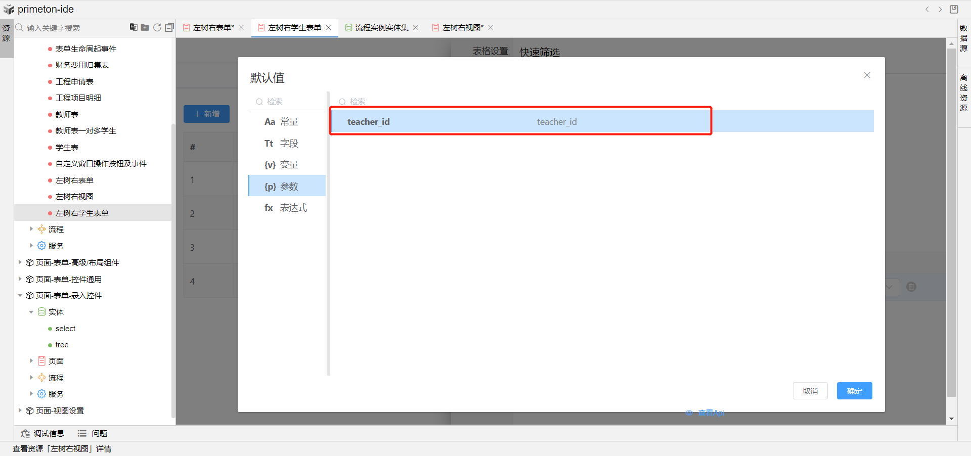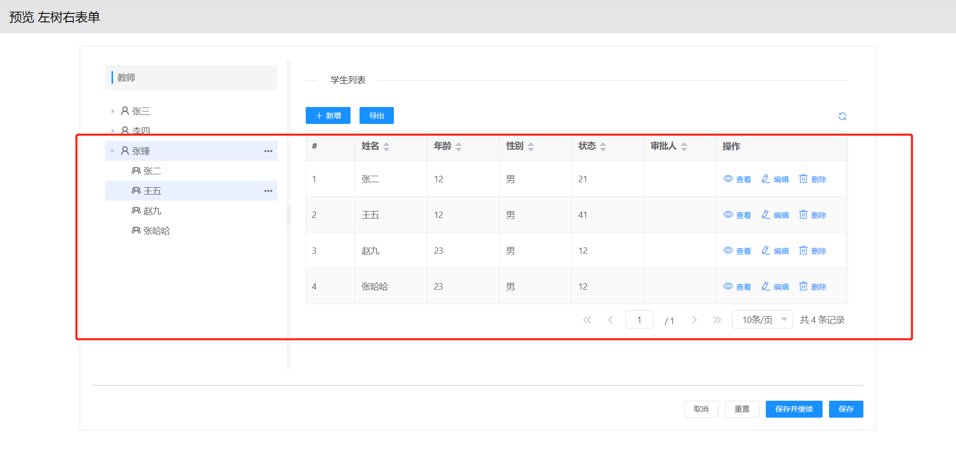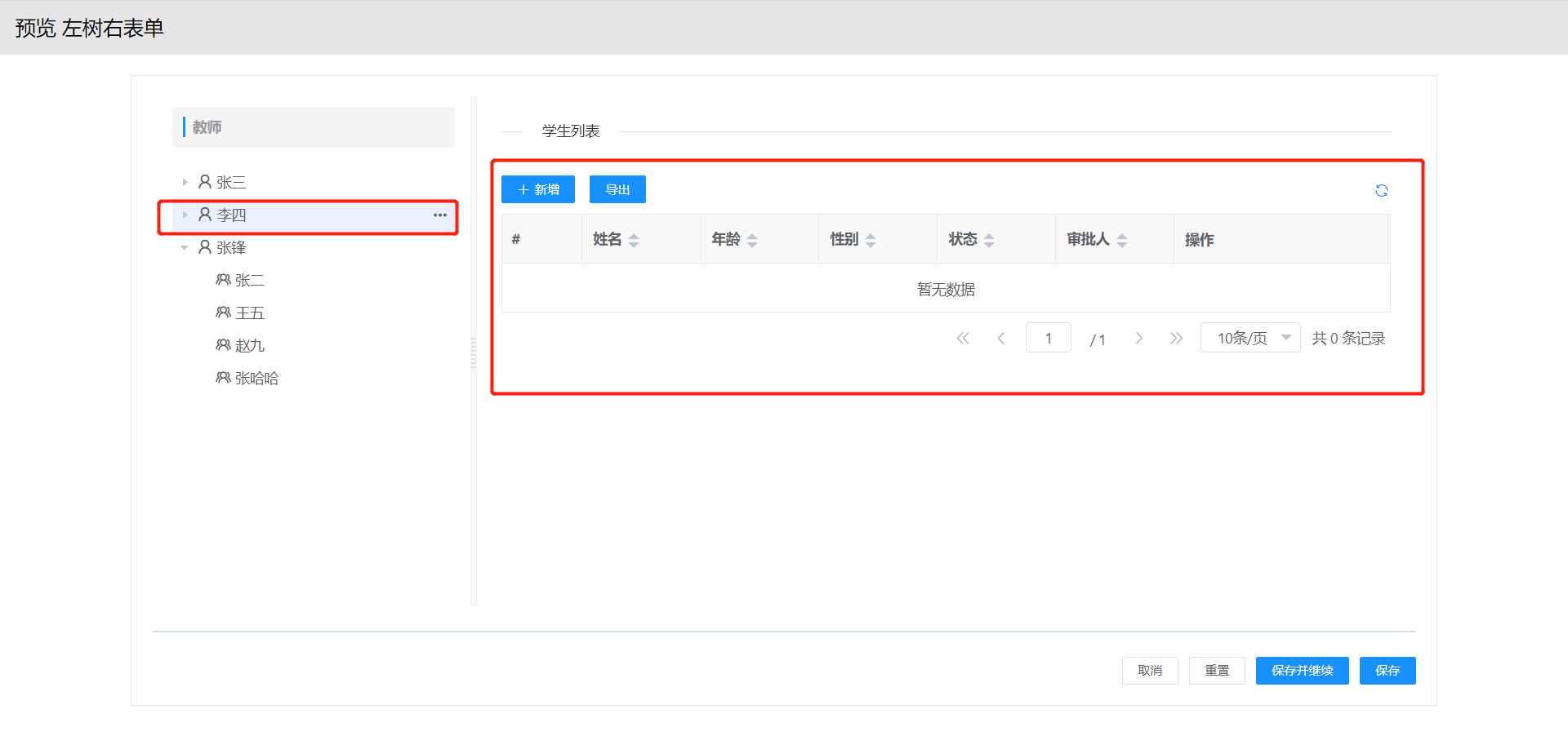 7.完成上述配置,即可预览左树右视图成果展示,点击左侧树教师信息,即可在右侧展示该教师下得学生信息视图。