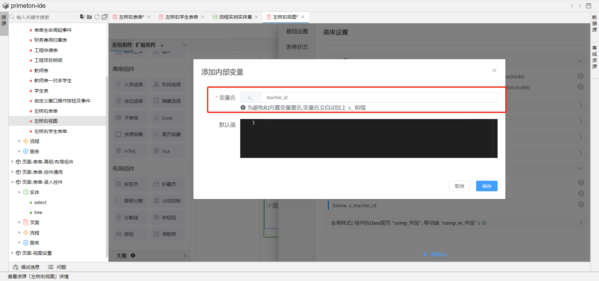 5.打开右侧分组控制中的学生视图资源容器高级配置,在扩展属性中新增属性定义,配置属性名为teacher_id,属性值为刚刚定义的变量v_teacher_id。