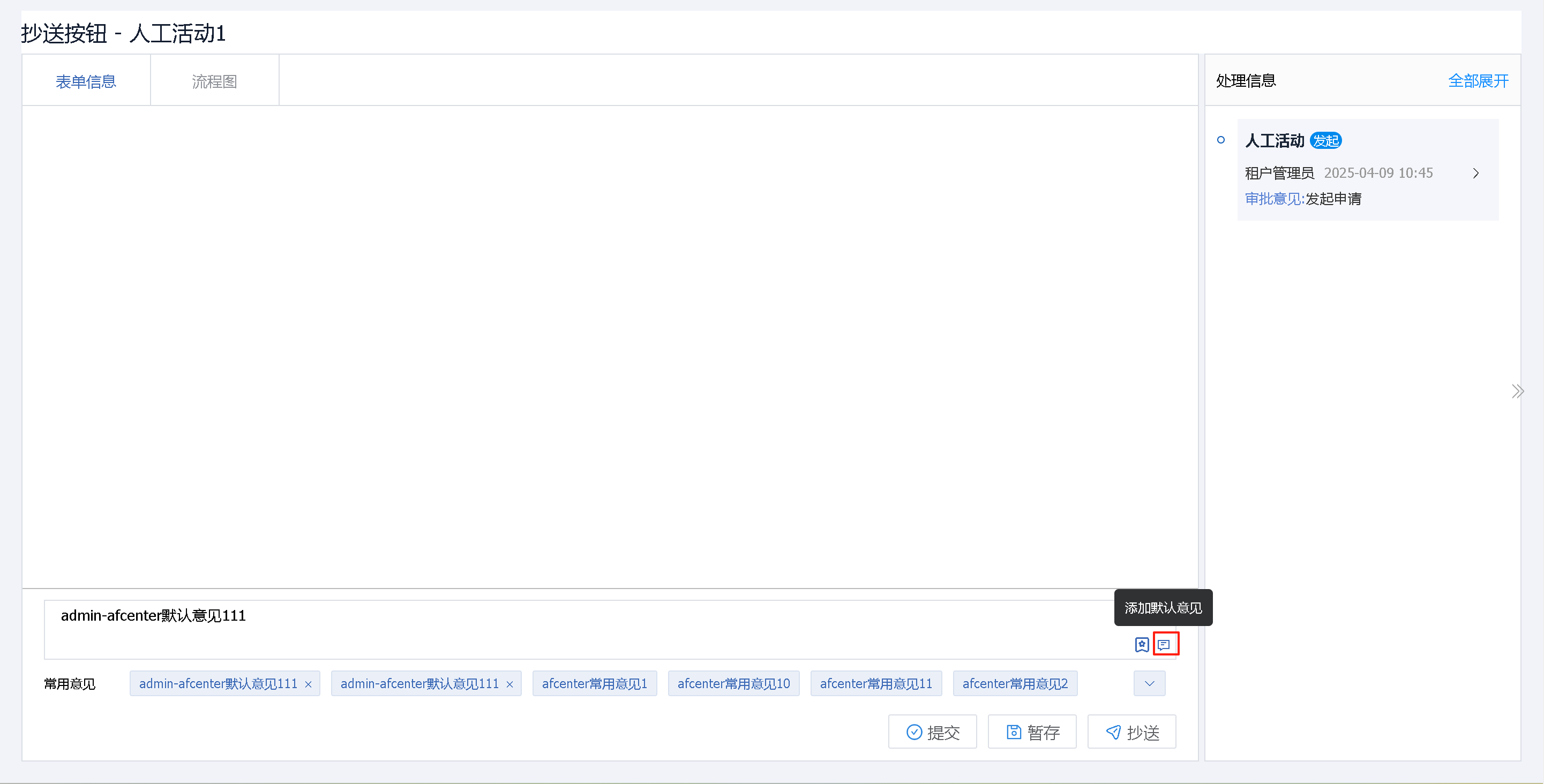 个人默认意见为用户唯一一个默认常用意见,该意见将作为当前登录用户审批时默认填写在审批意见框中。