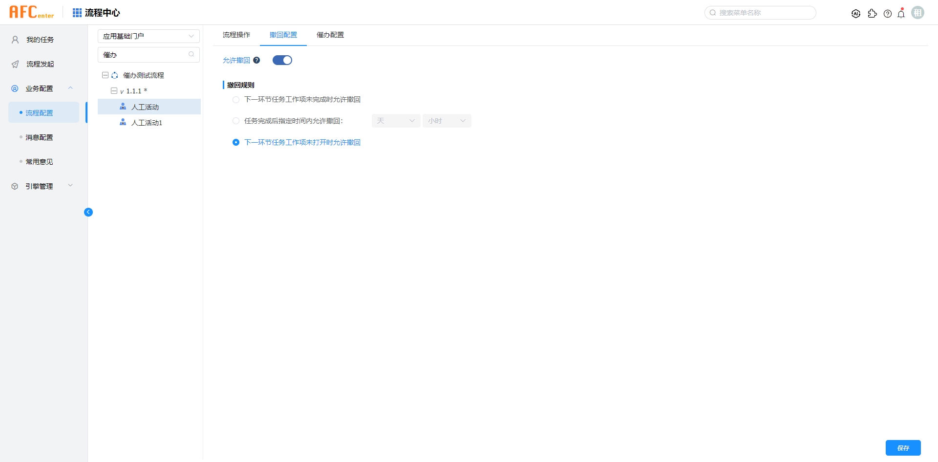 打开允许撤回按钮,当前环节允许撤回,撤回配置生效。下一环节任务工作项未完成是允许撤回。