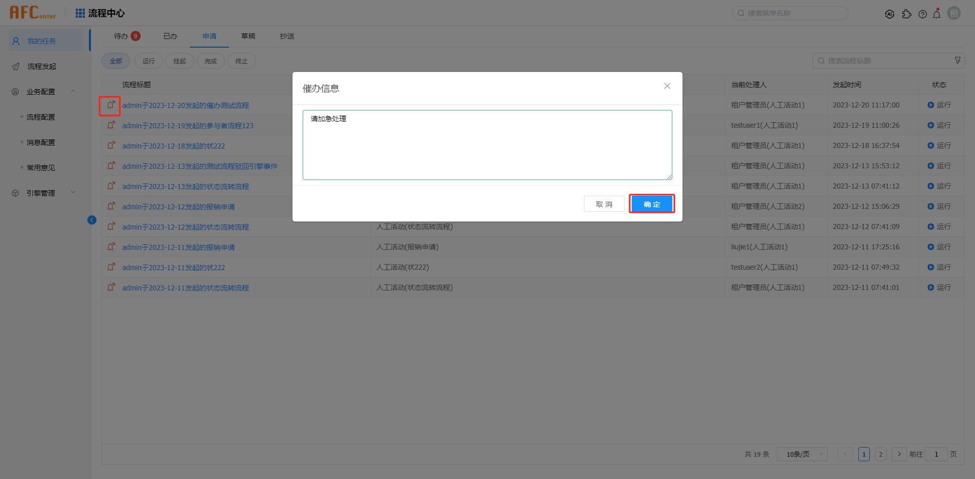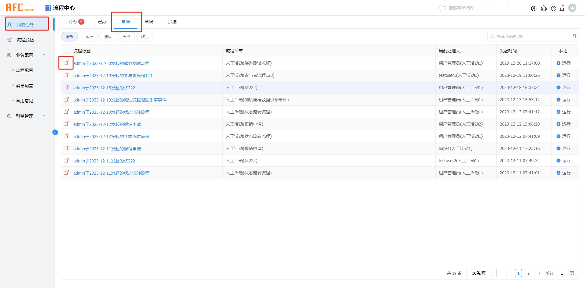 在我的任务我的申请页面中,可以看到设置了催办的流程会有红色催办图标。