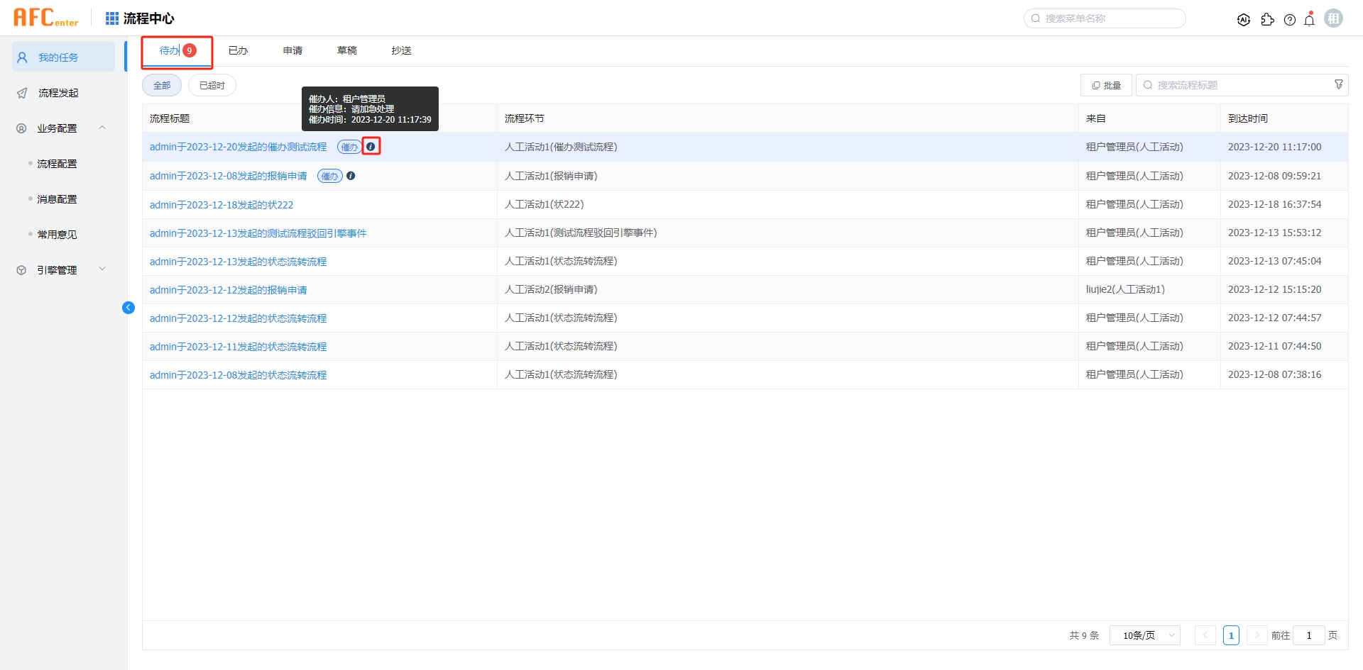 在待办任务列表中,鼠标移动至催办信息图标上可展示催办的具体信息。