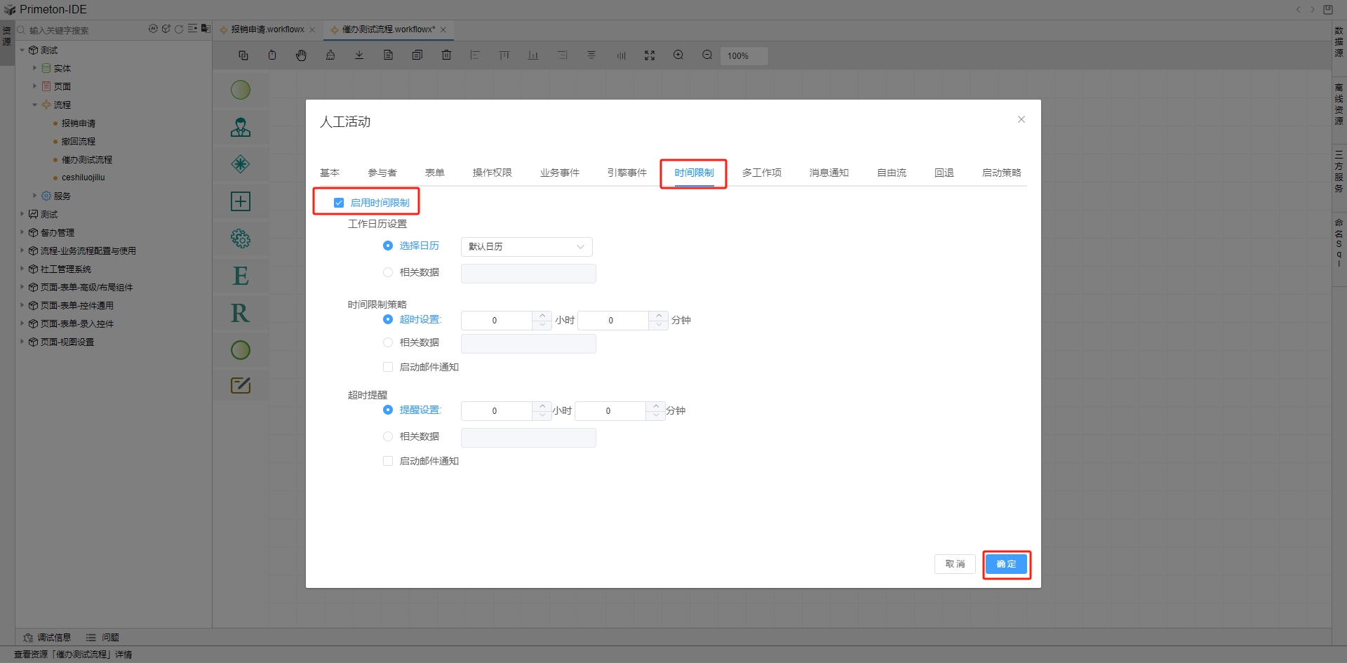 5. 时间限制:支持开启关闭,可以设置业务流程上线的时间段,超时将自动下线流程。
