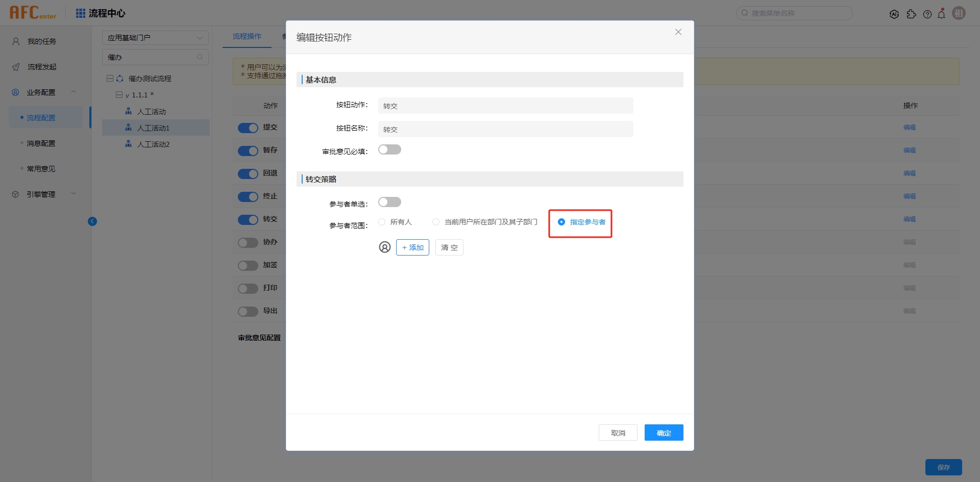 • 转交策略可以选择参与者范围:所有人、当前用户所在部门及其子部门、指定参与者。