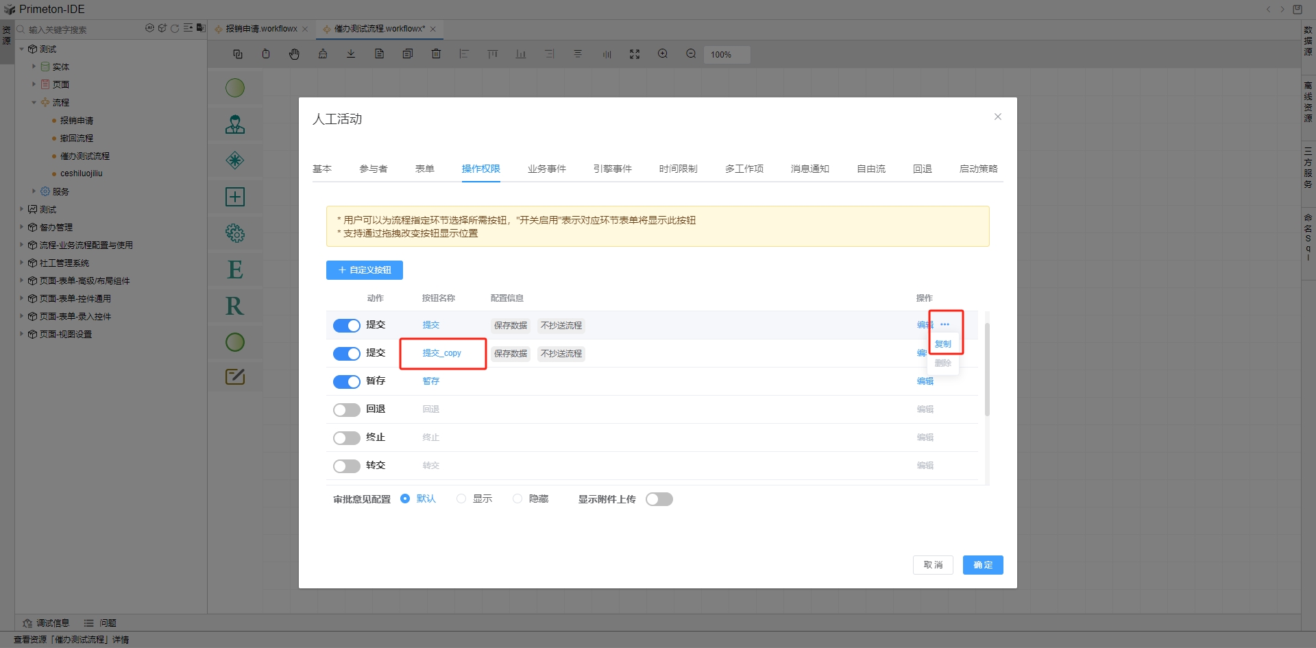 在ide中对提交按钮进行复制,根据业务需求添加参数,实现自定义按钮的功能。