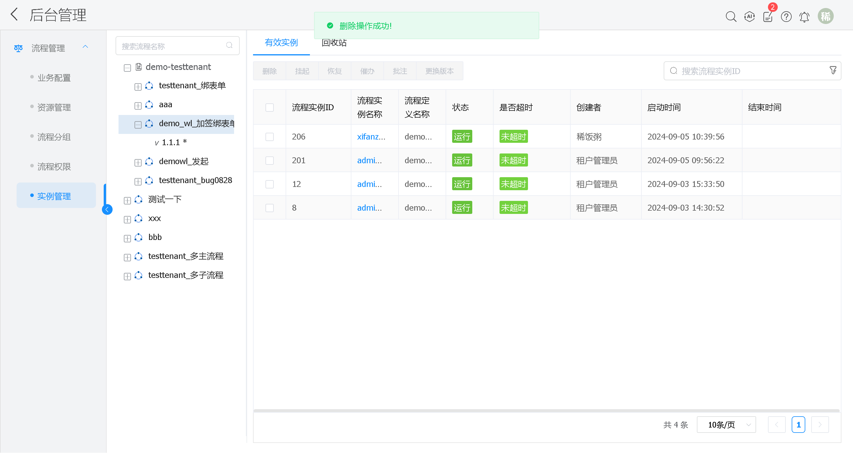 进行实例管理菜单,左侧导航选择demo_wl_加签绑表单,可查询到所有该流程的流程实例信息,并选择流程流程进行删除操作。