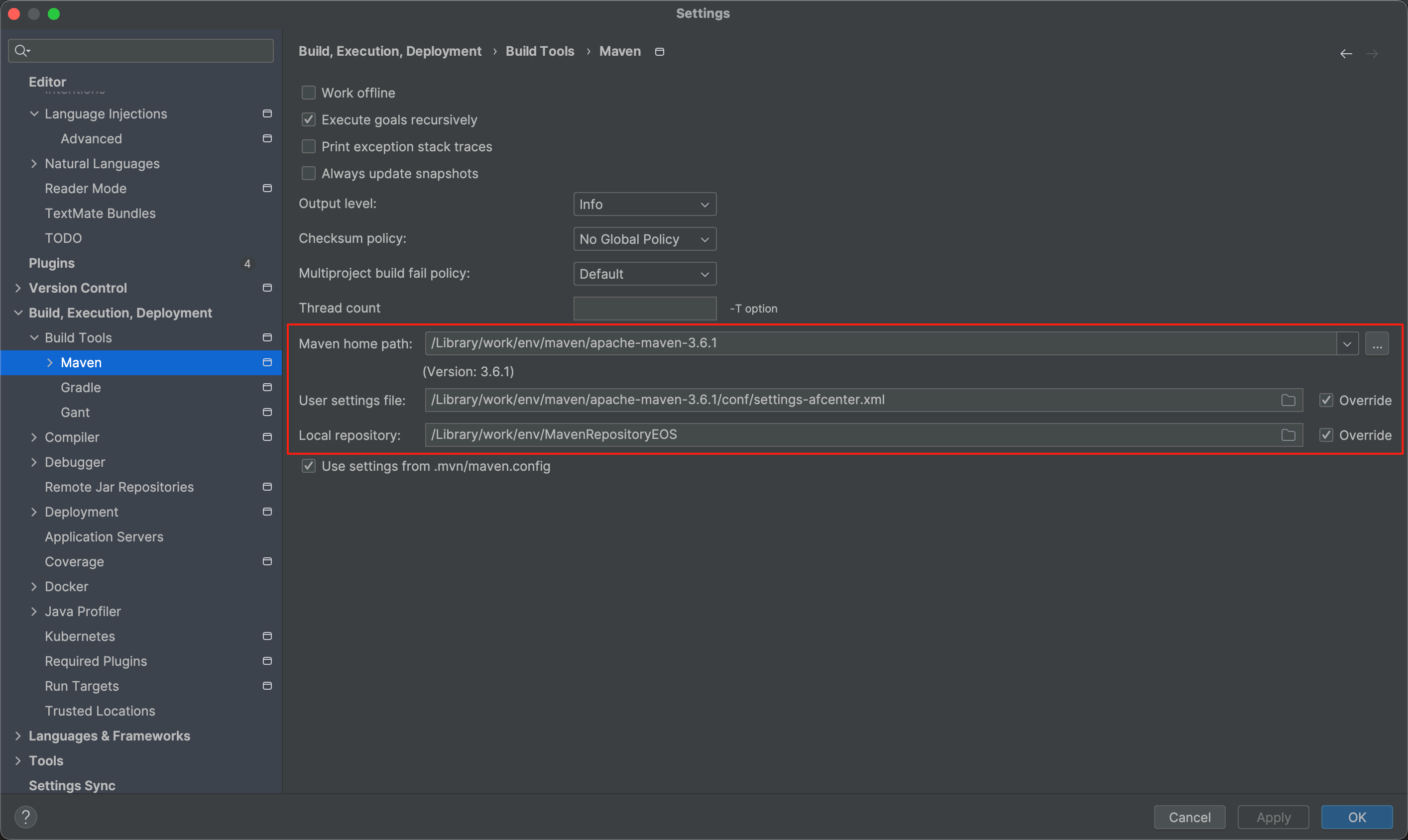 使用idea打看afcenter后端源代码项目后,配置正确的Maven的settings文件与仓库目录地址;(idea开发EOS项目前可参考EOS的Idea插件的使用文档)