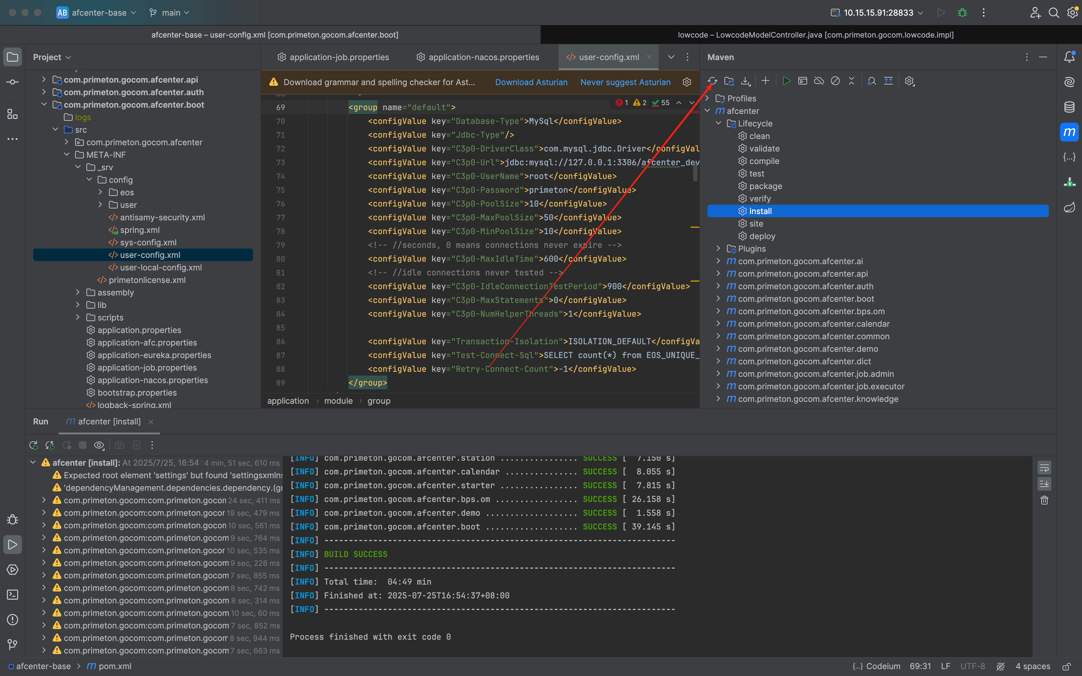 打开 com.primeton.gocom.afcenter.boot模块,找到src/META-INF/_srv/config/user-config.xml文件;找到数据库连接配置修改为自己的数据库连接配置即可;