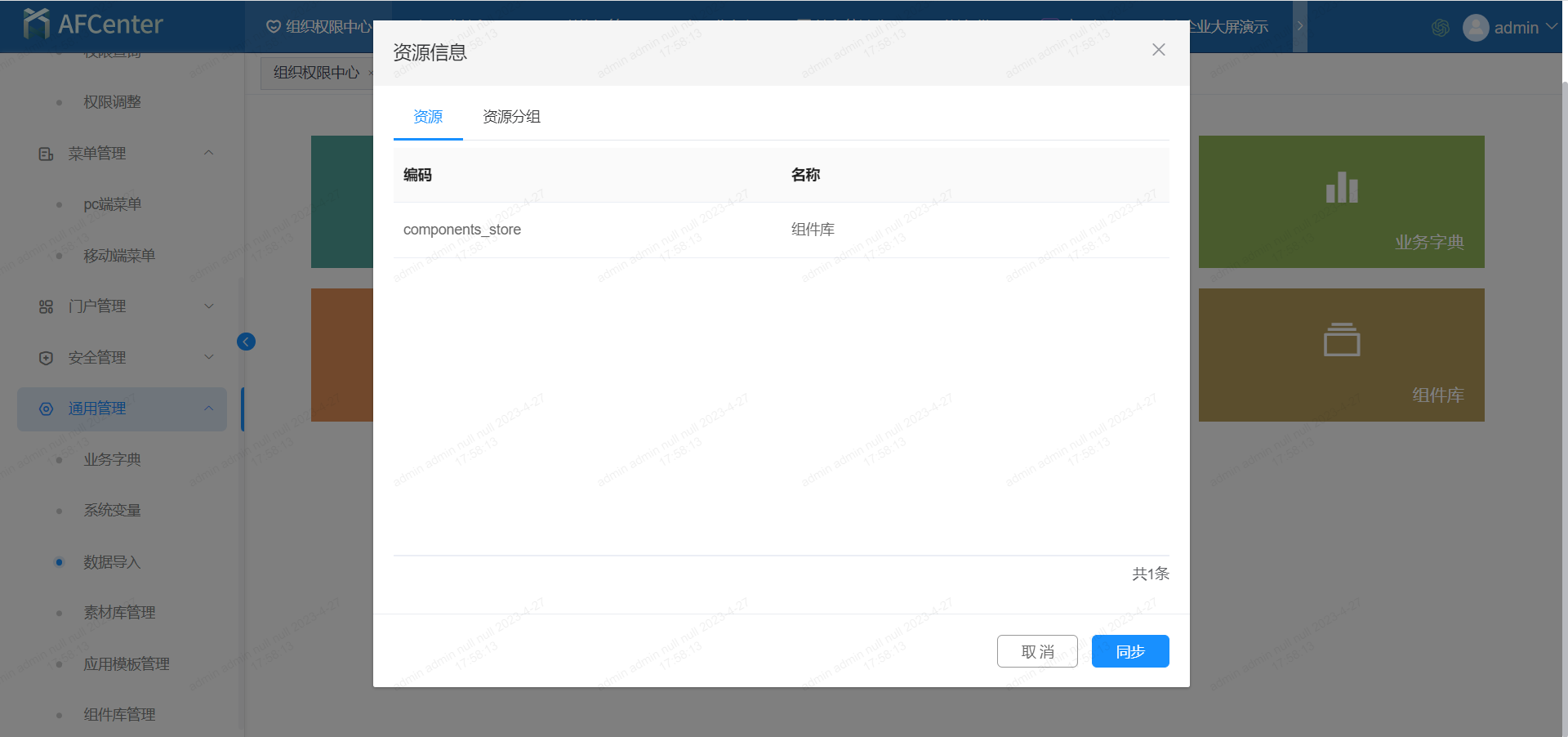 启动应用后,登录afcenter,在导航菜单栏点击组织权限中心然后在右侧点击通用管理,选择同步导入