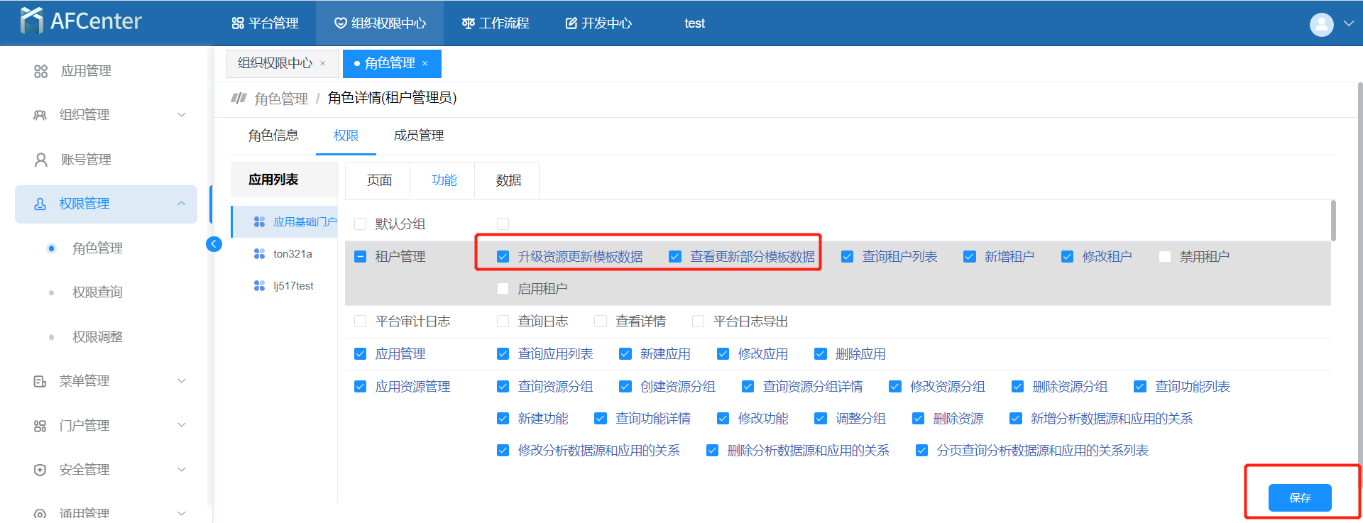 b.在角色管理中进入租户管理员管理页面,给刚刚创建的两个功能码授权。